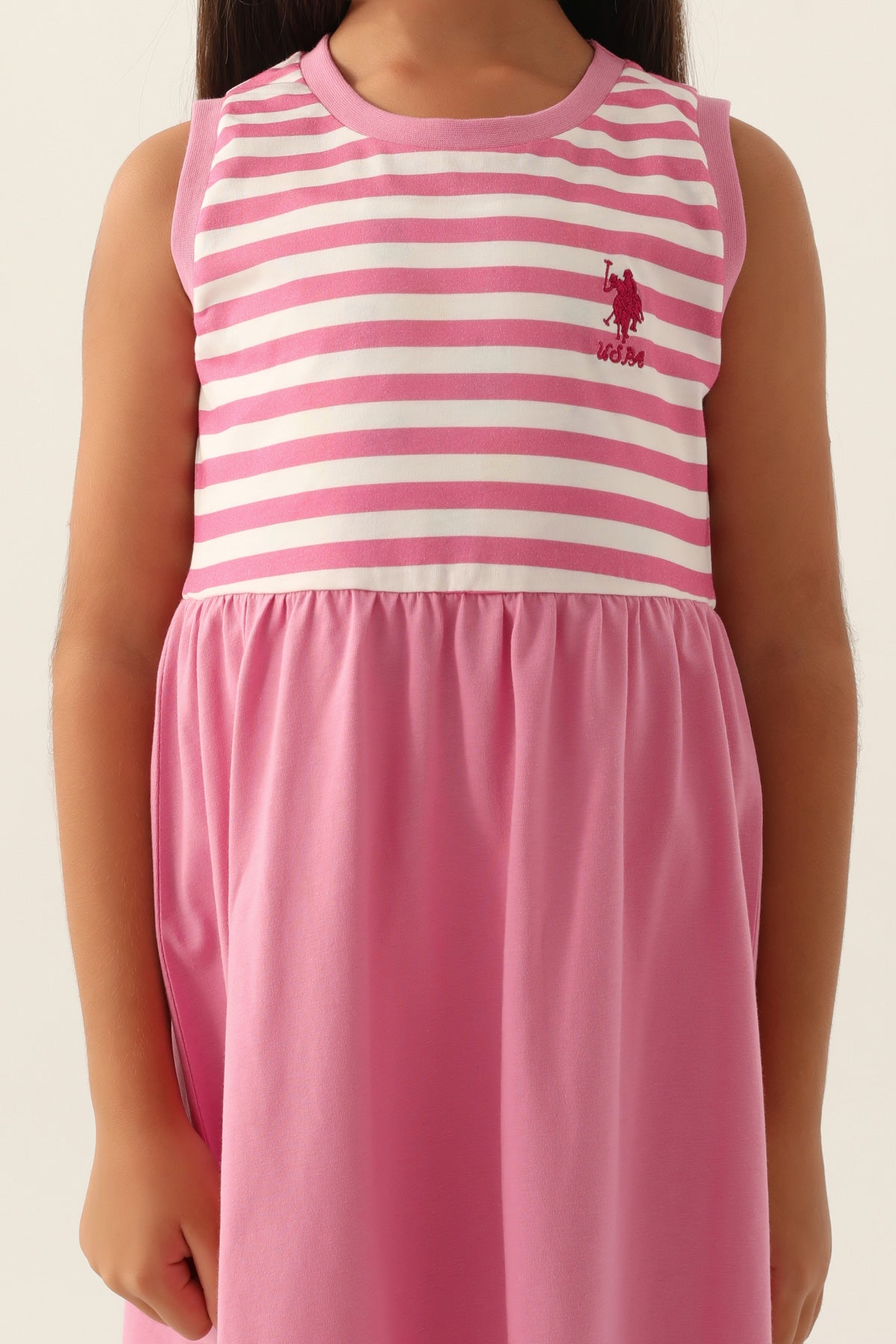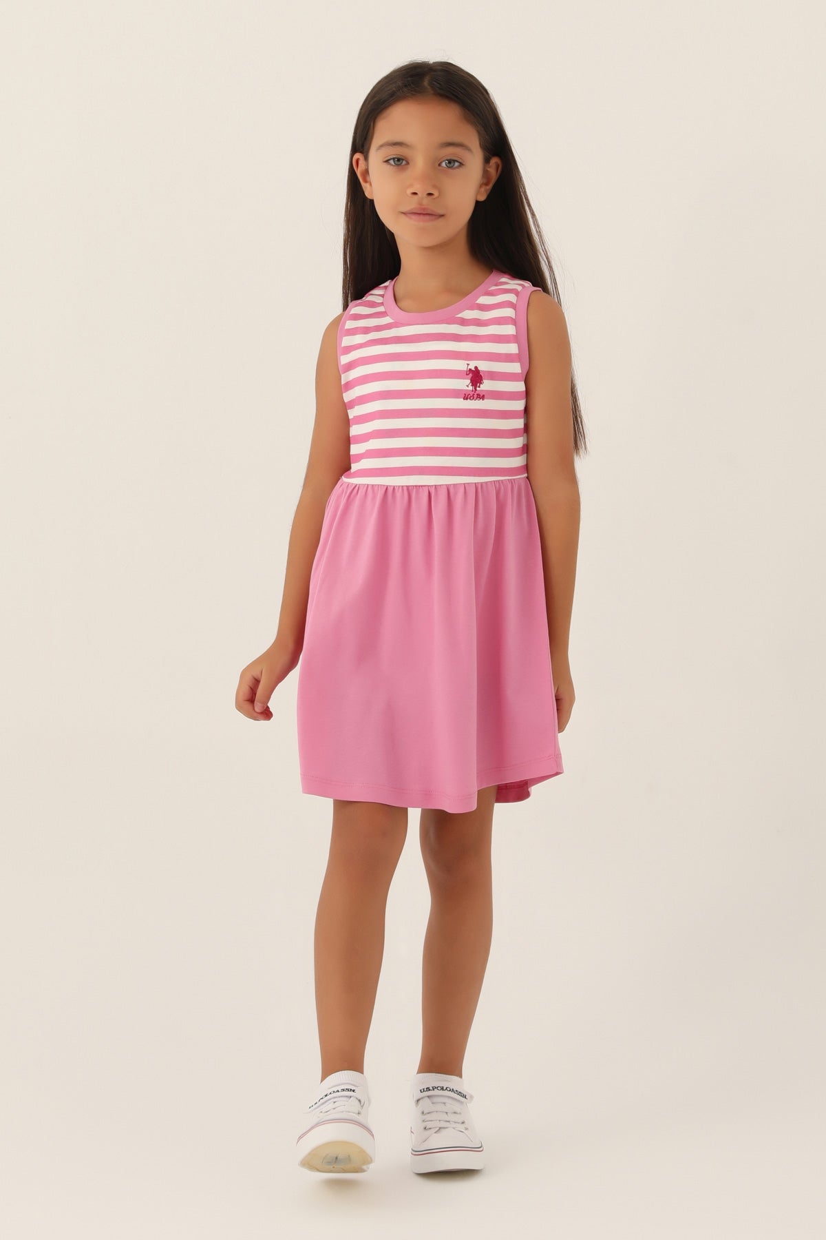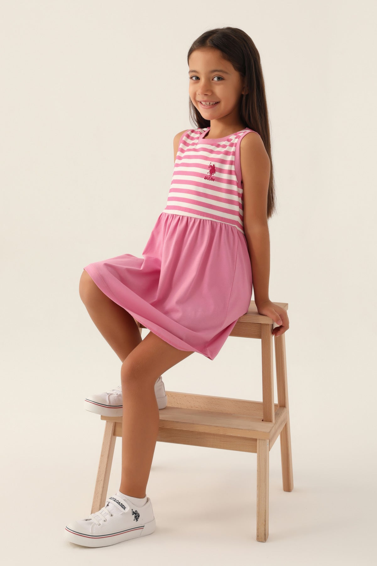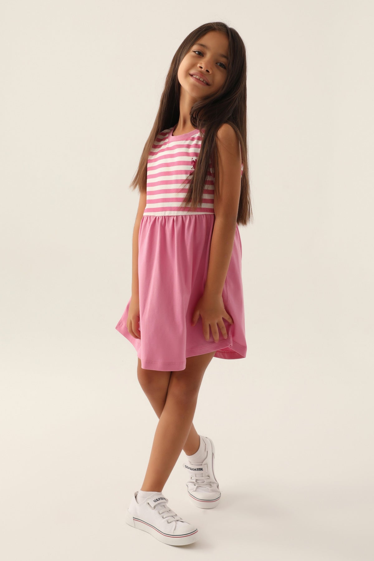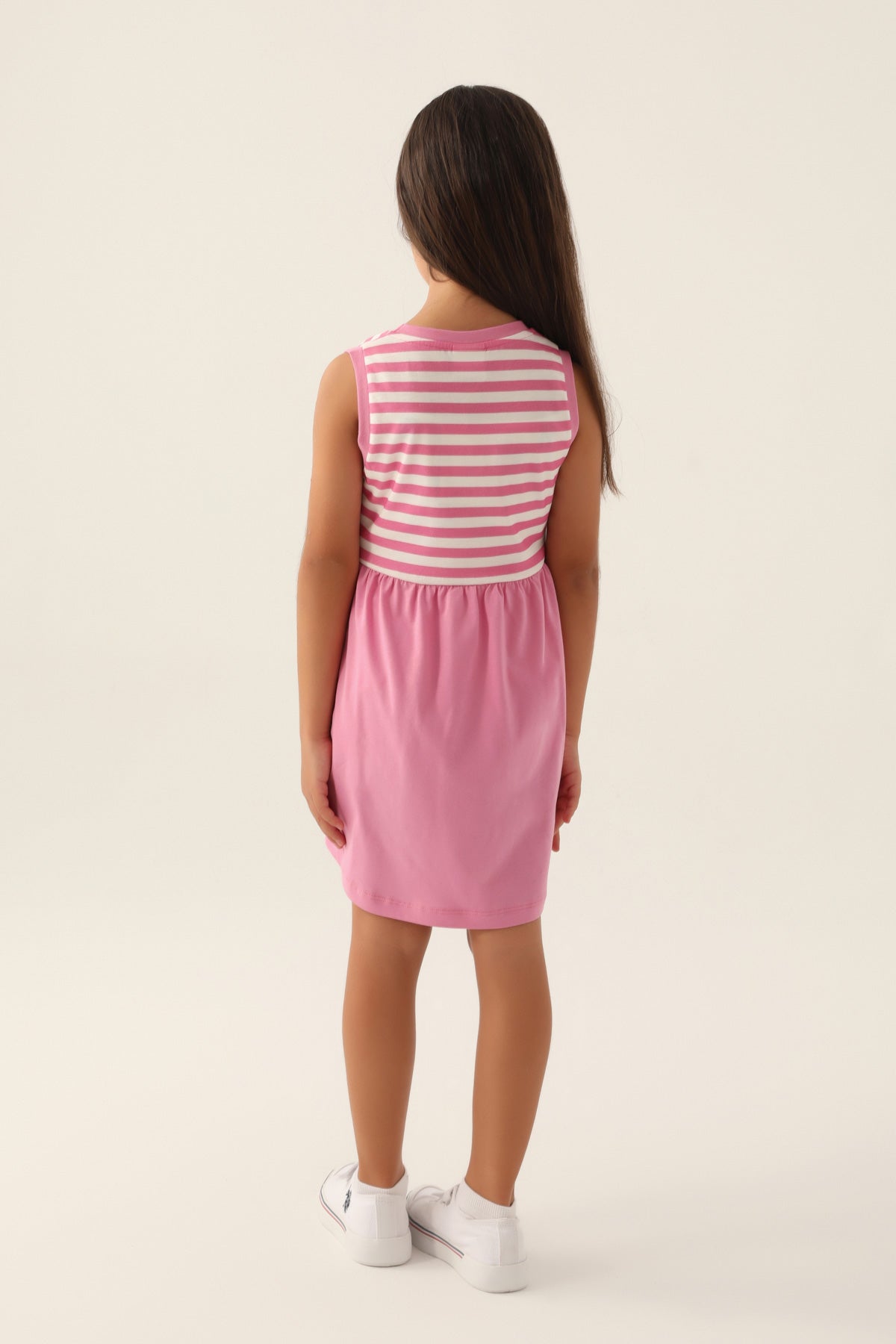 Haljina za devojčice kombinuje klasičan šik sa dečijom razigranošću. Gornji deo haljine karakterišu horizontalne pruge u beloj i roze boji koje dodaju simpatičnu dinamičnost, dok donji deo u jednobojnom roze nijansi pruža svečani izgled. Na prsima se nalazi mali, ali upečatljiv, ukrasni detalj koji doprinosi šarmu. Haljina je bez rukava, što omogućava slobodu pokreta i idealna je za tople dane. Izrađena od mekog i udobnog materijala, ova haljina garantuje udobnost tokom celog dana, bilo da je reč o rođendanskoj proslavi, porodičnom okupljanju ili običnom danu u školi. Kombinuje se lako sa baletankama ili patikama za potpunu i funkcionalnu kombinaciju.