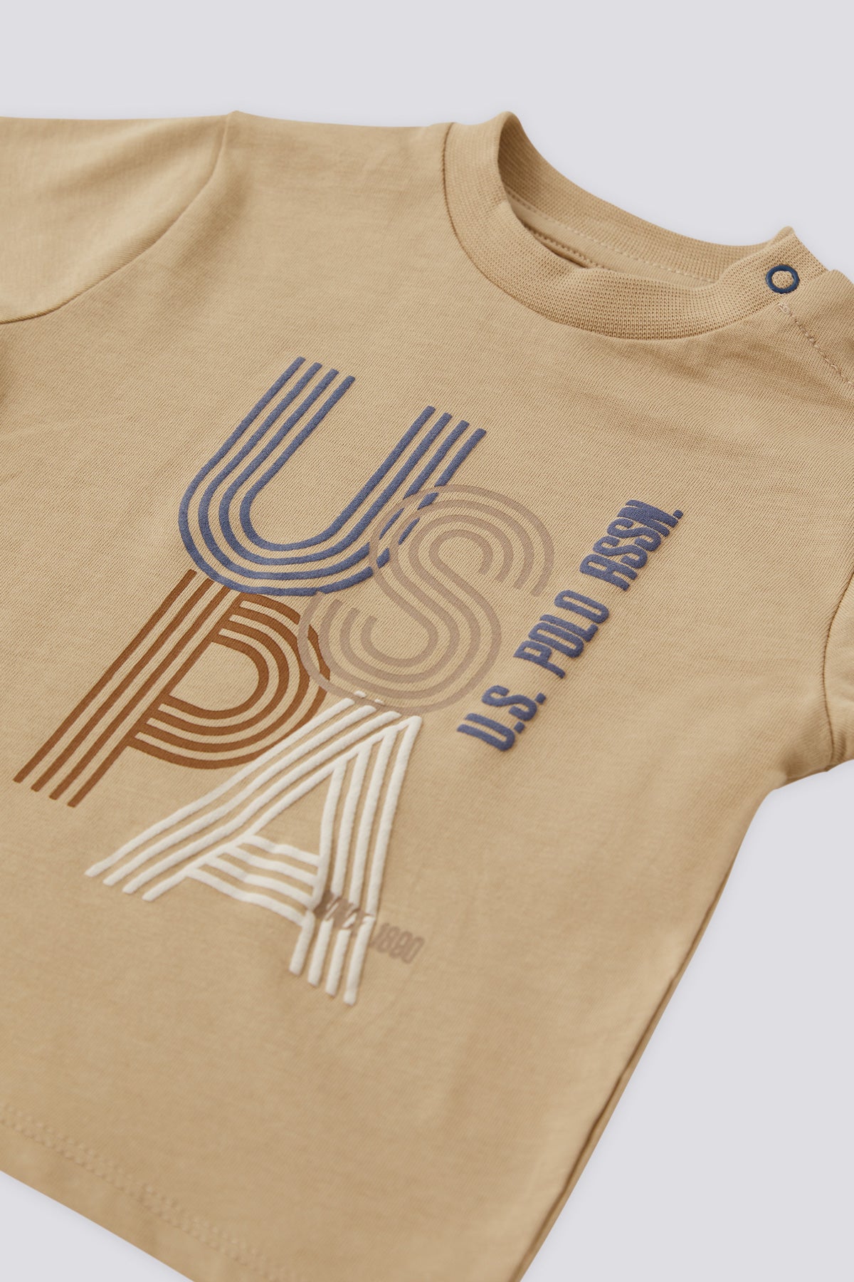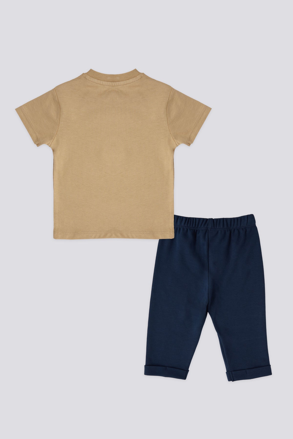 Moderan dečiji komplet sastoji se od bež majice kratkih rukava sa štampom u vidu velikih slova, koja unosi dozu urbanog stila, i udobnih teget pantalonica. Pantalonice karakteriše opušteni kroj koji pruža slobodu pokreta, a detalj logotipa na levoj nogavici doprinosi prepoznatljivom izgledu. Komplet je idealan za letnje dane, nudeći kombinaciju udobnosti i modernog dizajna, lako se uklapa u dnevne aktivnosti i igru, a može se nositi sa patikama ili sandalama za potpunu ležernost.