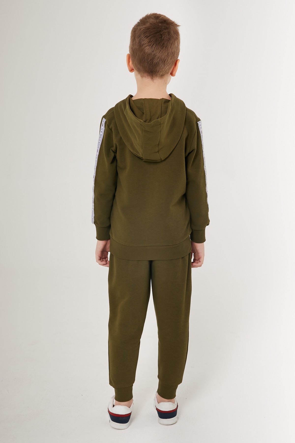 Sportski zeleni duks sa odgovarajućim pantalonama predstavlja udoban komplet za decu, idealan za svakodnevne aktivnosti. Karakteriše ga opušteni kroj koji omogućava slobodu pokreta, dok su na rukavima duksa bele trake koje dodaju sportski izgled. Duks ima štampani logo na prednjoj strani, a pantalone su jednostavnog dizajna sa praktičnim džepovima sa strane. Izrađen od mekog i toplog materijala, ovaj komplet je savršen za hladnije dane. Na nogama nosi bele patike sa crnim detaljima, koje upotpunjuju casual izgled.