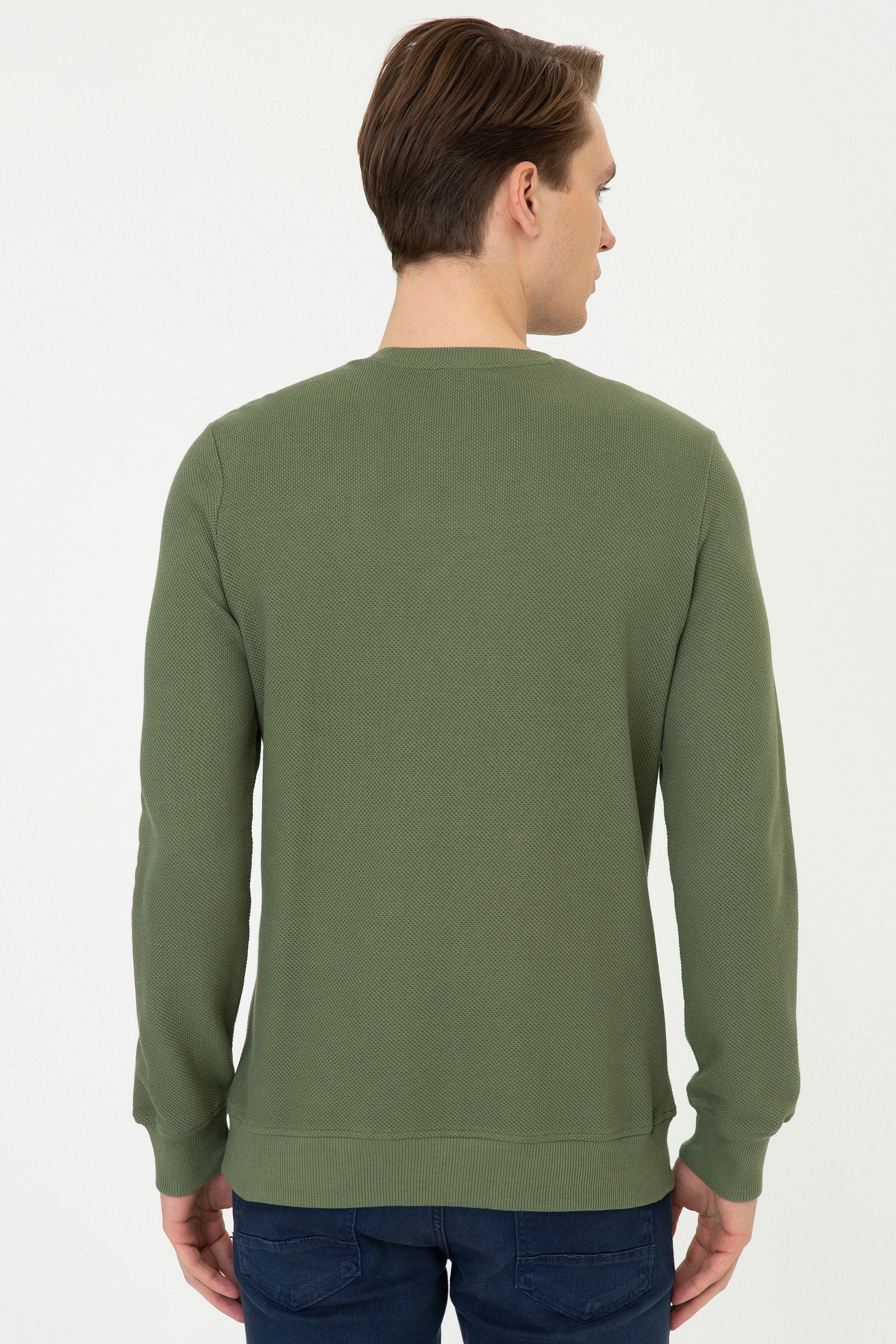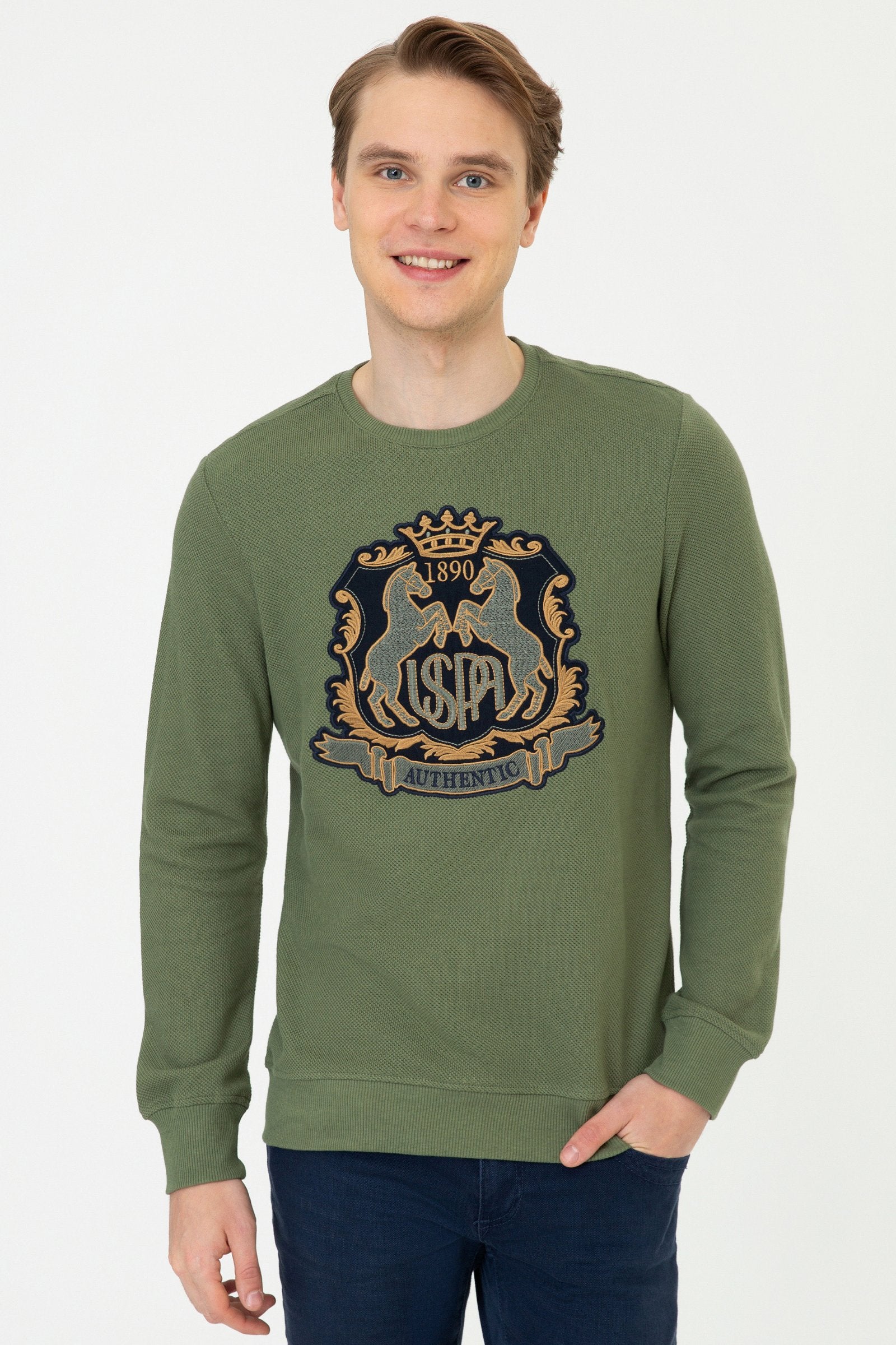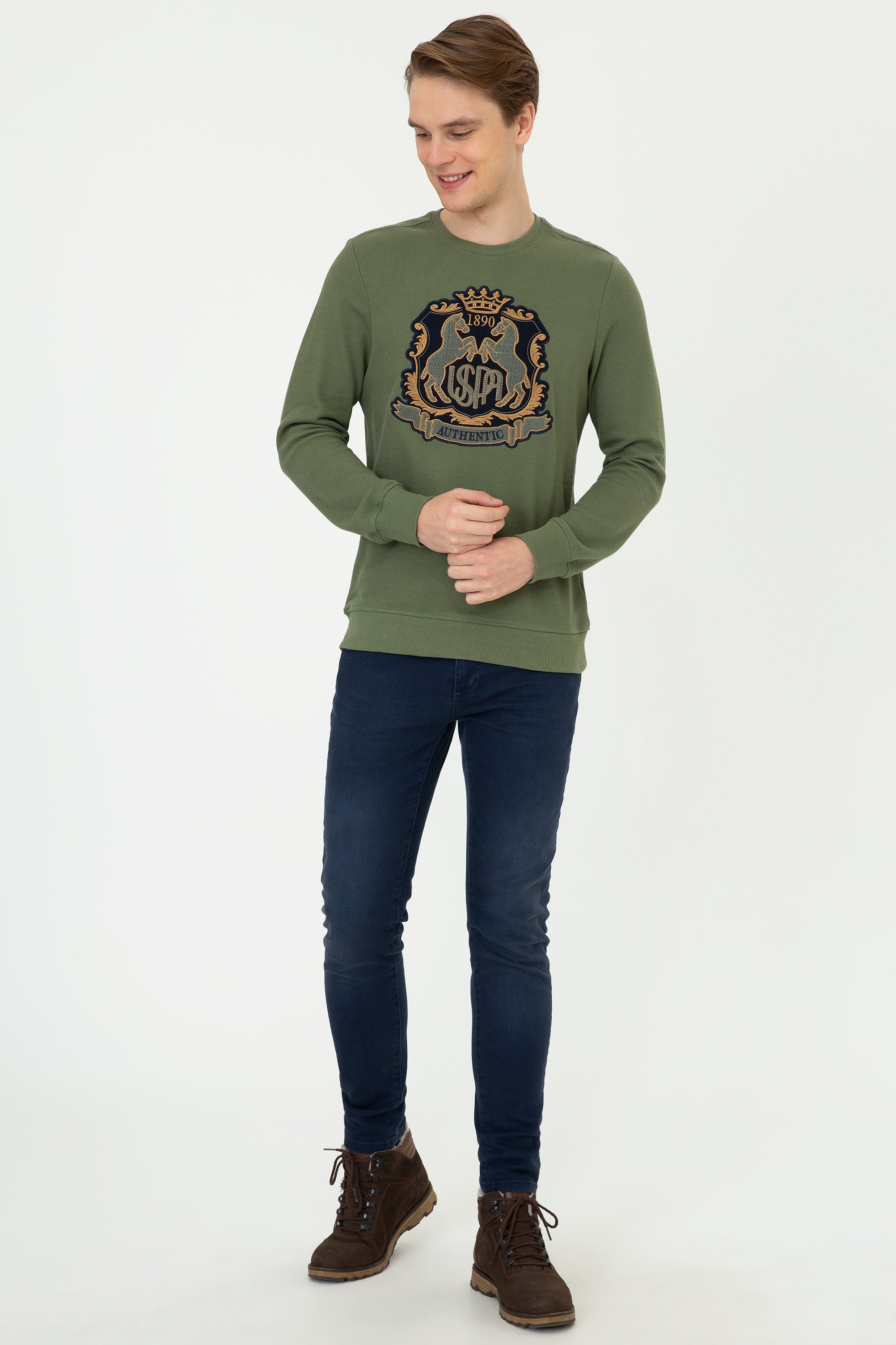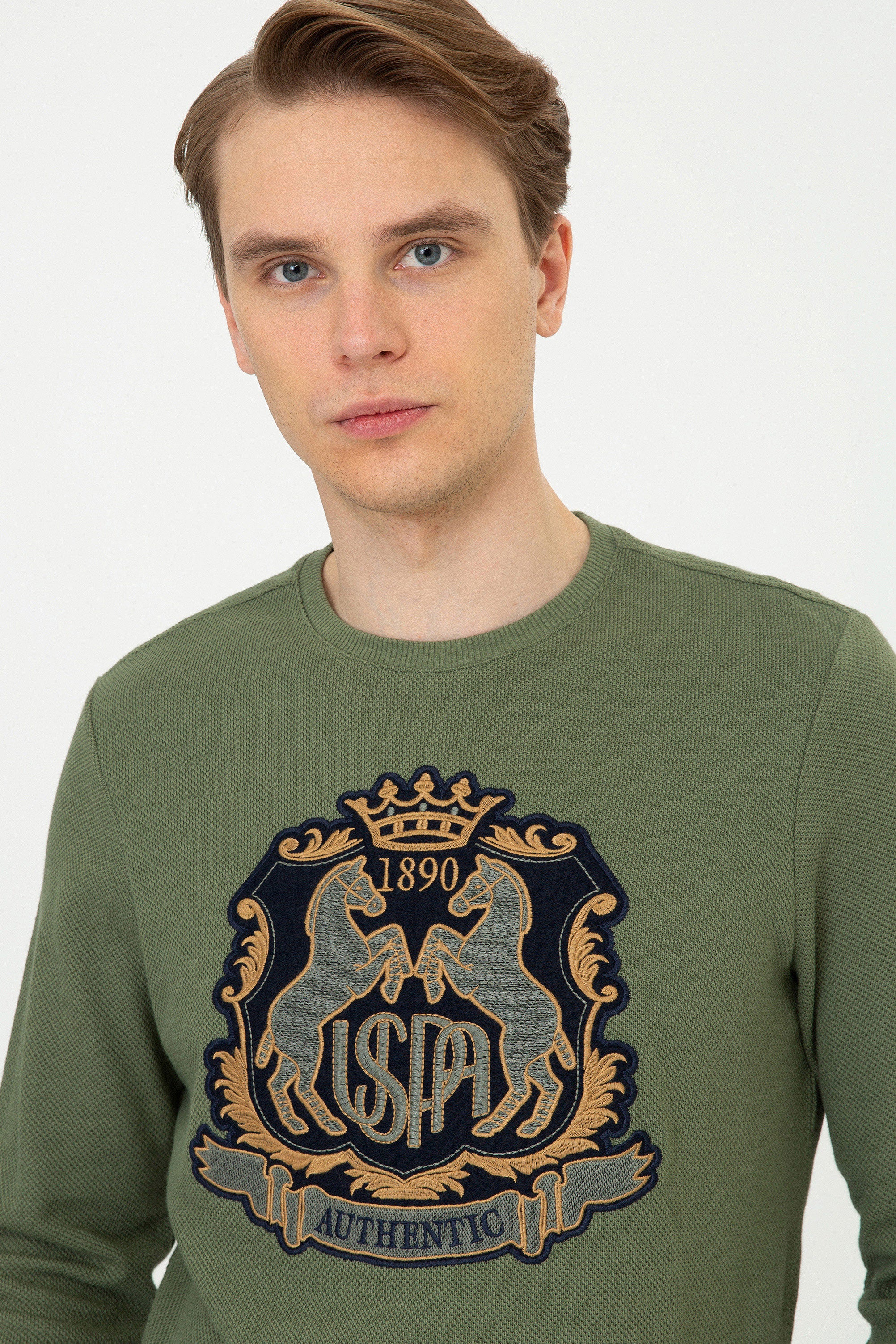 Udobna muška majica dugih rukava u bogatoj maslinasto zelenoj nijansi savršeno će se uklopiti u svakodnevne kombinacije. Karakteriše je prijatna tekstura koja omogućava komfor i slobodu pokreta prilikom nošenja. Na prednjoj strani ističe se veliki ukrasni print sa heraldičkim motivima i natpisom koji dodaje autentični retro šarm. Ova majica je idealan izbor za kombinovanje sa jeansom ili chino pantalonama, odlična za casual prilike, a lako se prilagođava i različitim stilovima, od sportskog do poluformalnog.