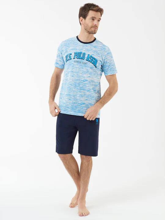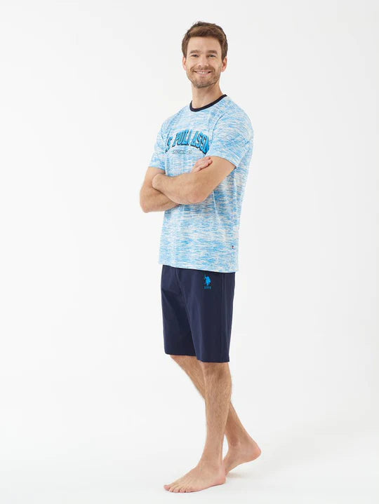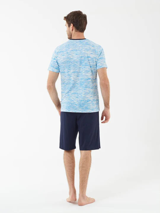 Opušteni muški komplet sastoji se od kratkih pantalona i majice kratkih rukava, idealan za ležerne letnje dane. Majica je plave boje sa efektnim belo-plavim prelivima koji podsećaju na morske talase, a ističe se velikim štampanim natpisom u predelu grudi. Kratke pantalone su tamnoplave boje, jednostavnog kroja, sa malim logotipom marke na donjem delu nogavice. Ovaj komplet je izrađen od laganih materijala koji pružaju maksimalnu udobnost i slobodu pokreta, što ga čini savršenim za plažu, šetnju ili opuštanje kod kuće.