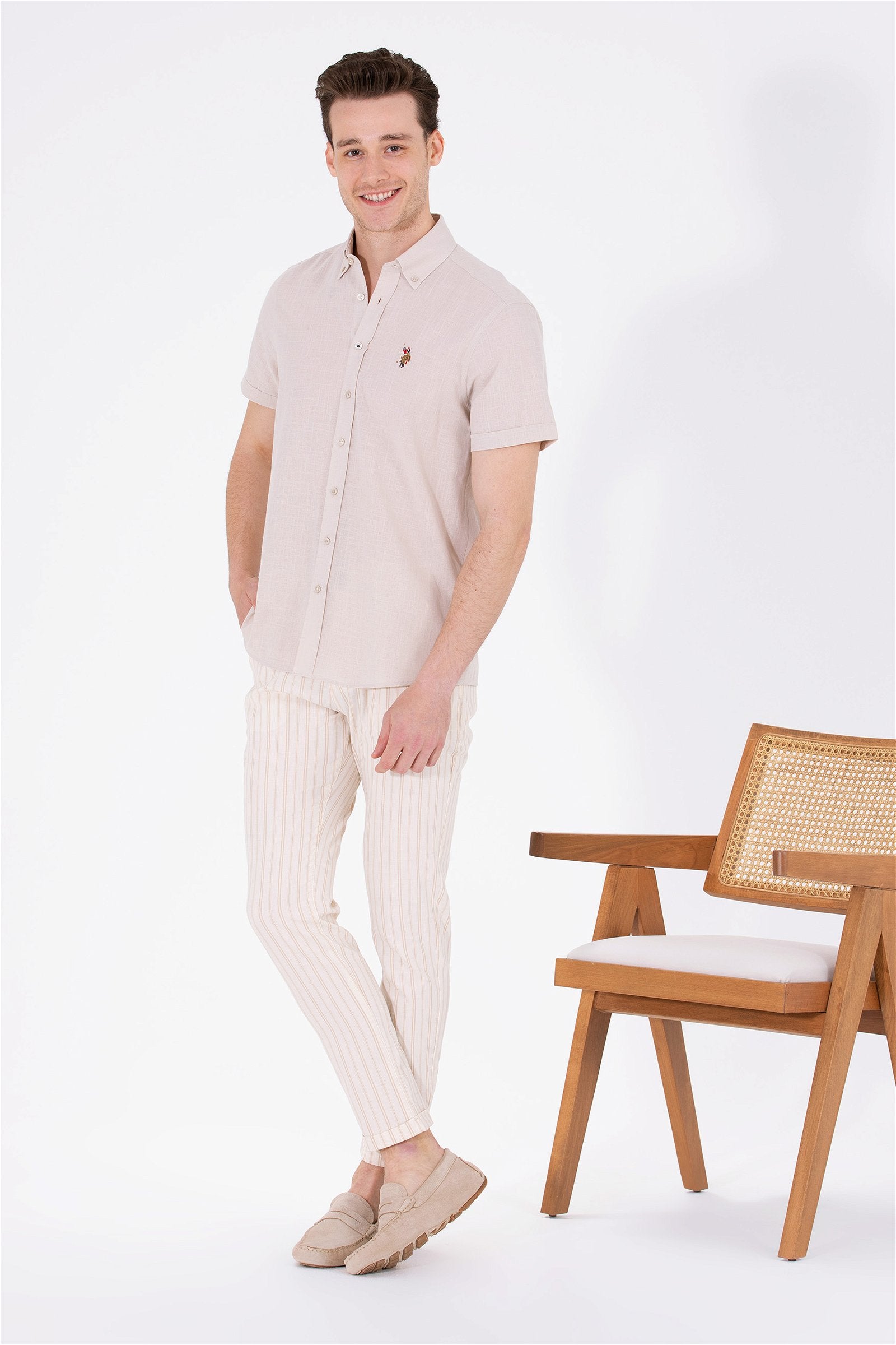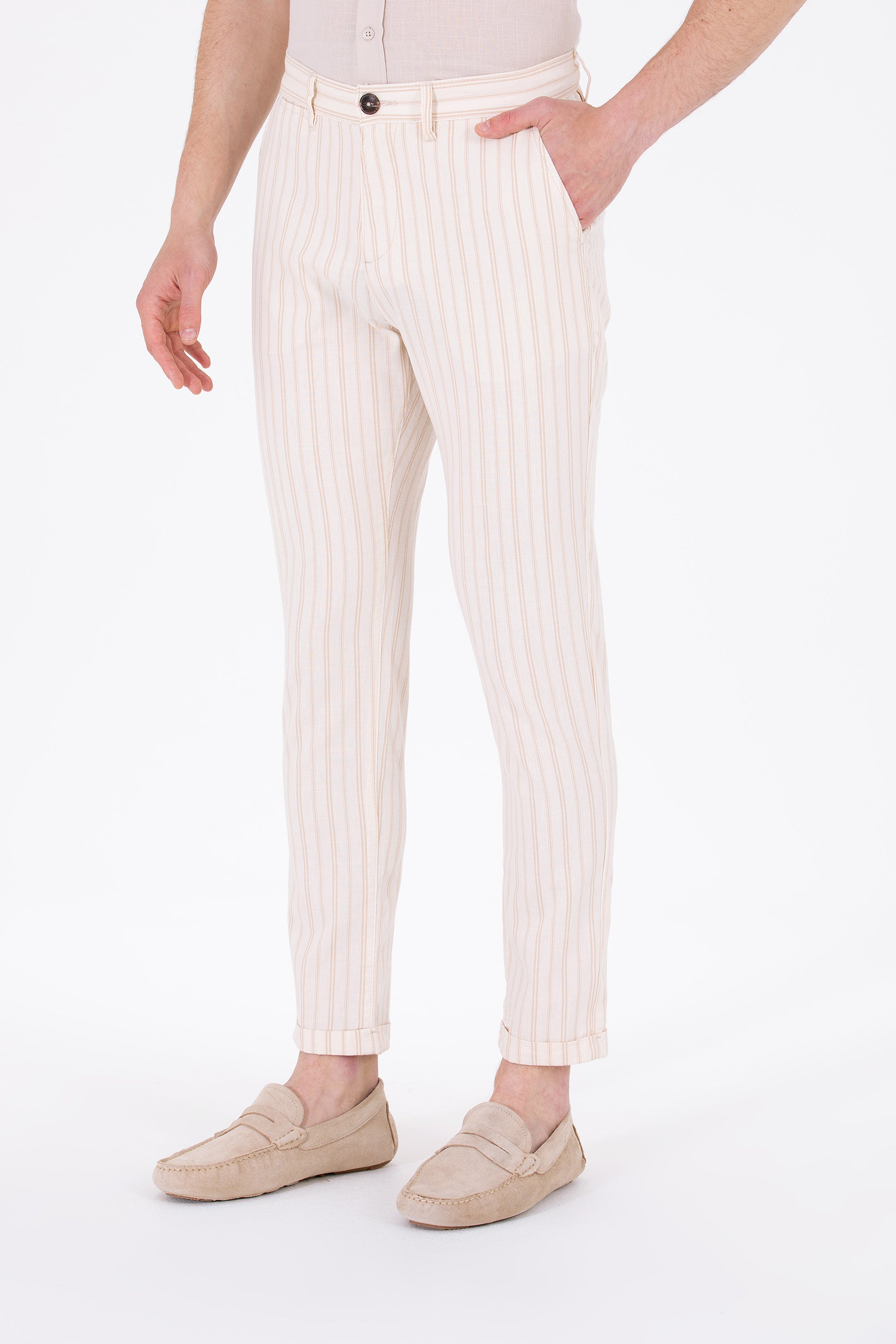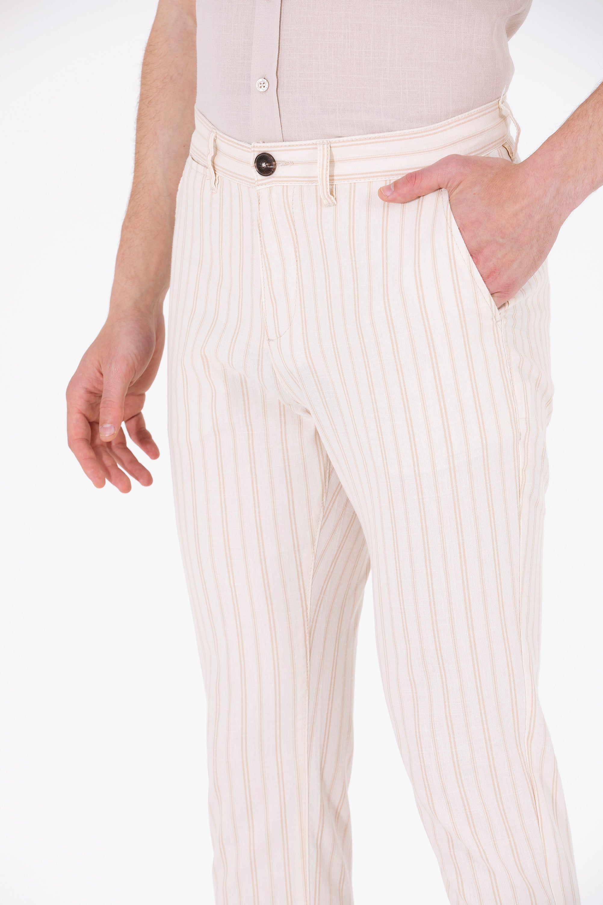 Klasične muške pantalone u svetlo bež boji sa decentnim vertikalnim prugama pružaju eleganciju i sofisticiranost nosiocu. Izrađene od kvalitetnog i prozračnog materijala, savršene su za proleće i leto. Uski kroj naglašava mušku figuru, dok visok struk osigurava udobnost. Pantalone odlikuje i diskretna gajka za kaiš koja omogućava lako prilagođavanje. Ovi pantaloni su idealni za poslovne i svečane prilike, te se mogu odlično kombinovati sa košuljama i sakoom za potpuni stilski izraz.