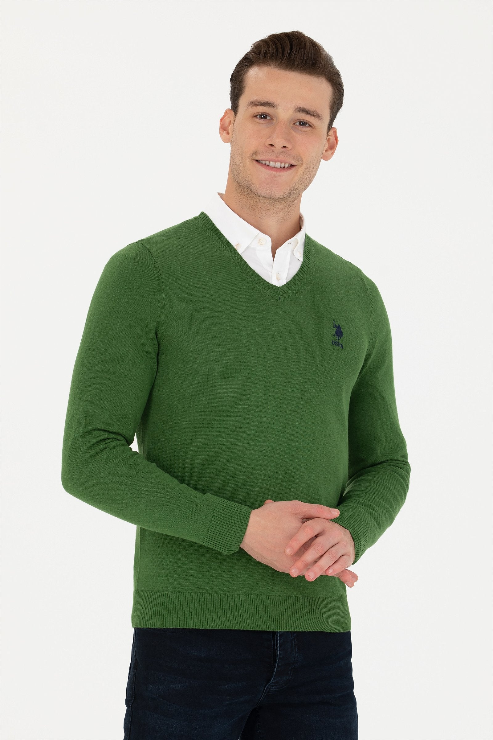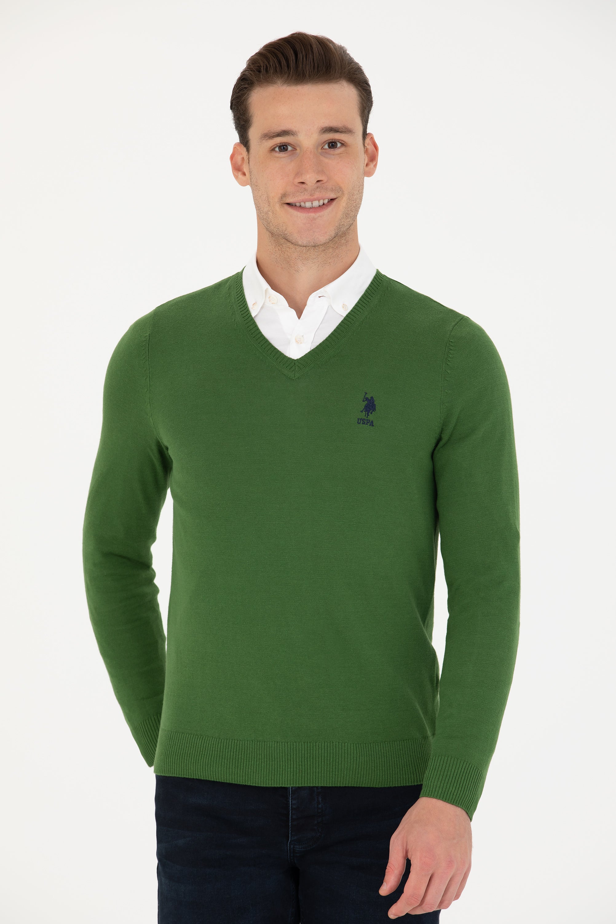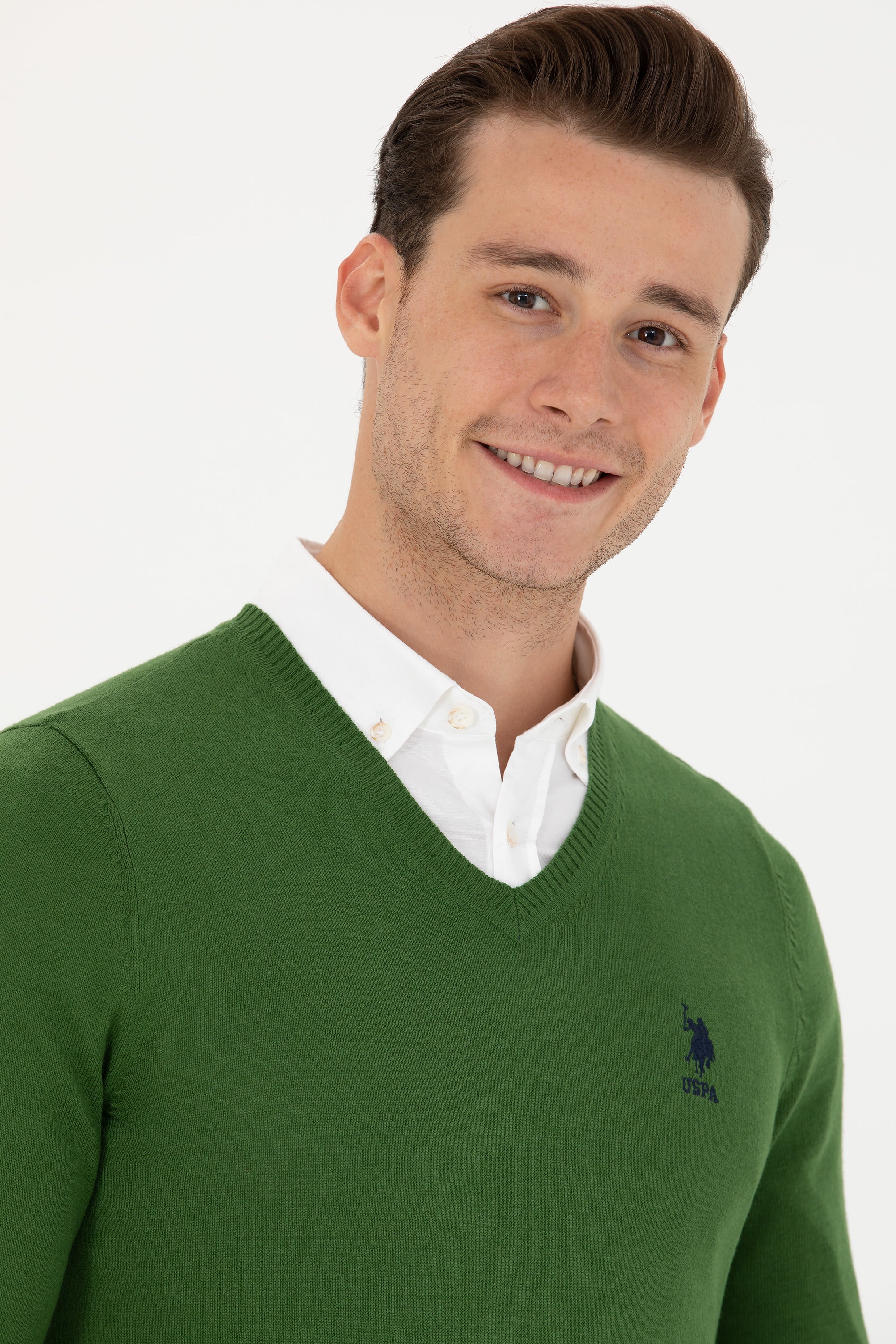 Muški zeleni džemper predstavlja spoj udobnosti i casual stila. Karakteriše ga jednostavan dizajn sa V-izrezom i finim rebrastim detaljima na rubovima rukava i donjem delu džempera. Izrađen je od mekog materijala koji obezbeđuje toplotu i komfor, čineći ga savršenim izborom za svakodnevno nošenje. Džemper je uparen sa belom košuljom ispod, što dodaje notu formalnosti i čini ga pogodnim za poslovne i poluformalne prilike. Može se kombinovati sa različitim vrstama pantalona, od džinsa do chino pantalona, za različite izglede.