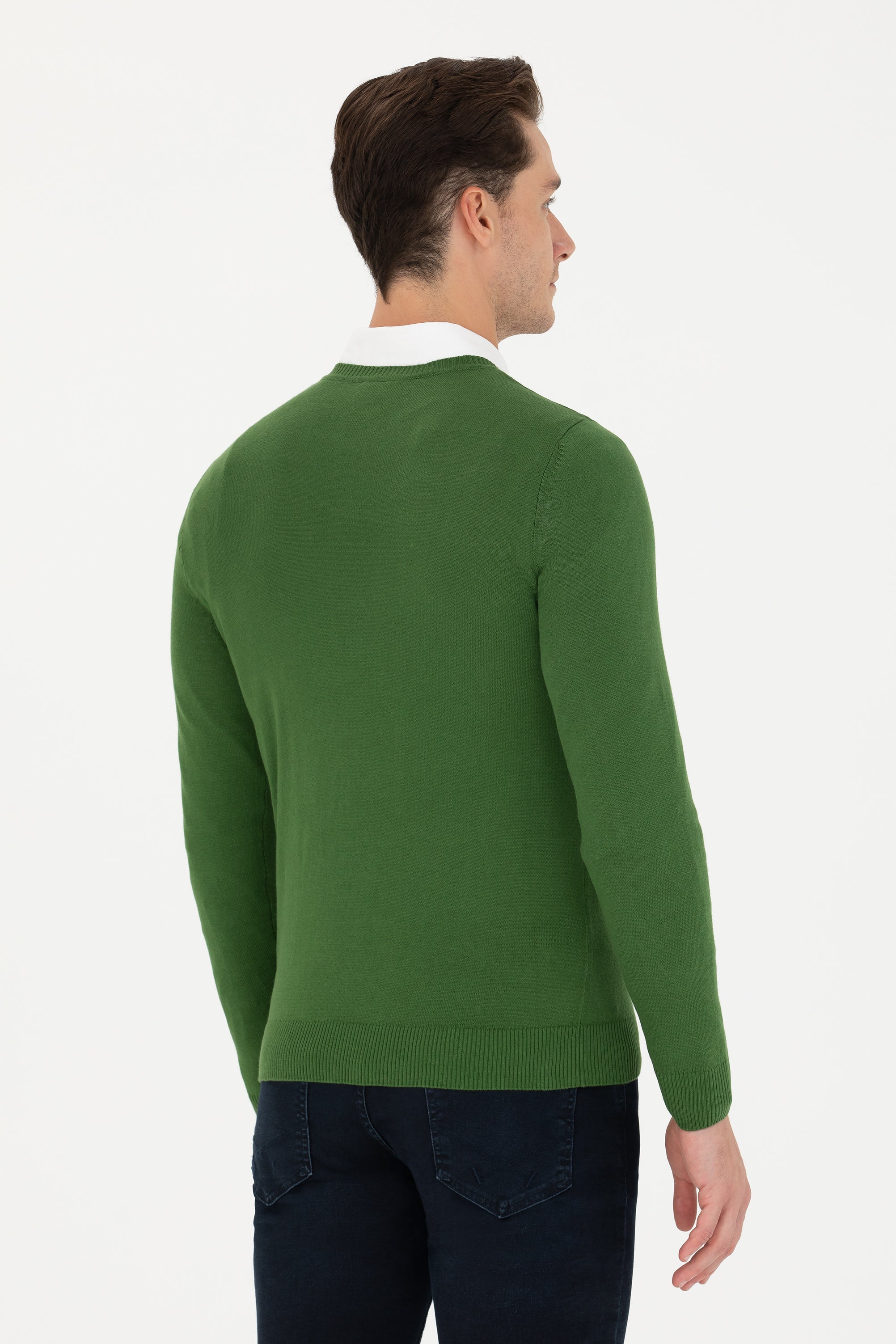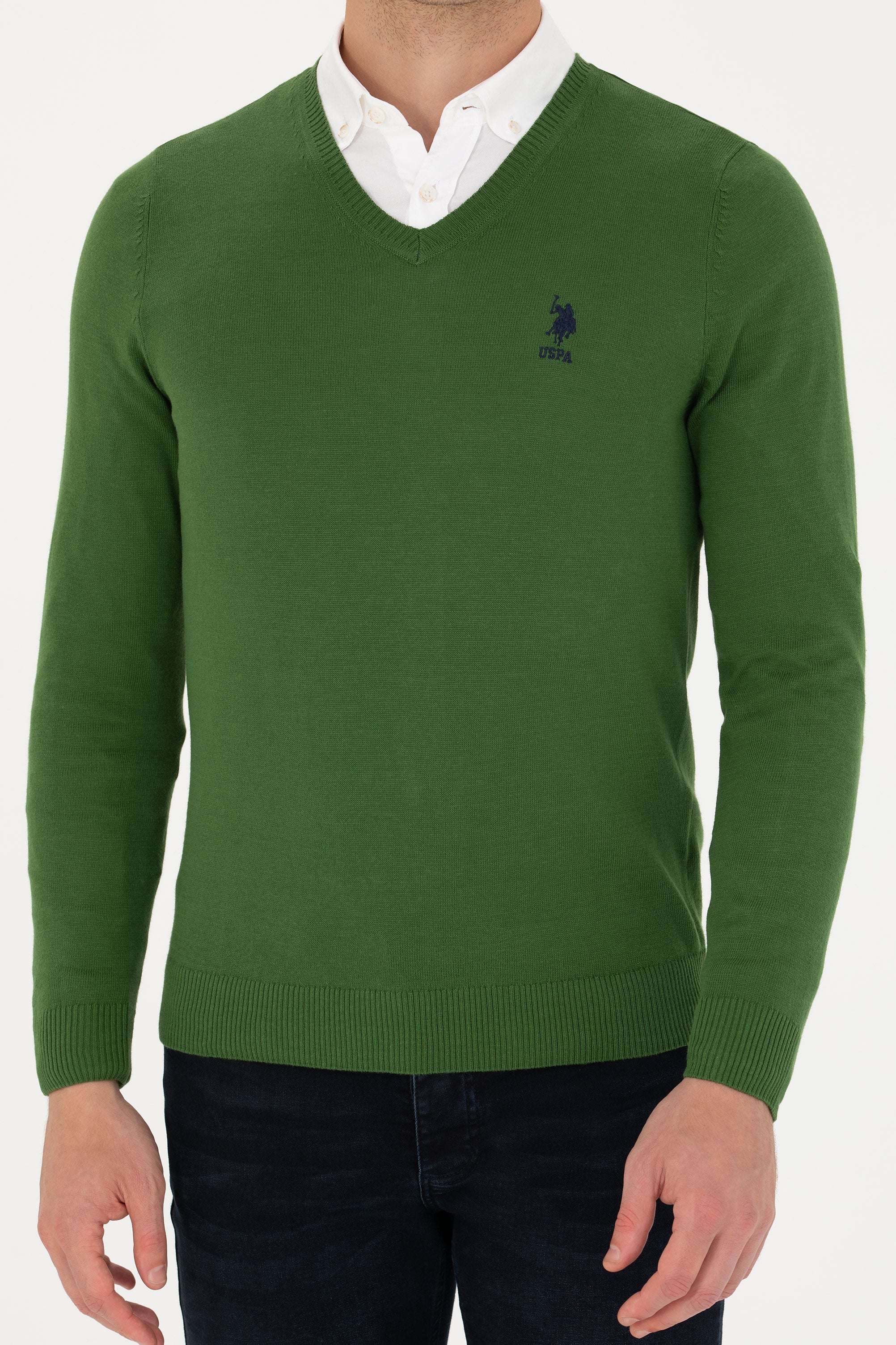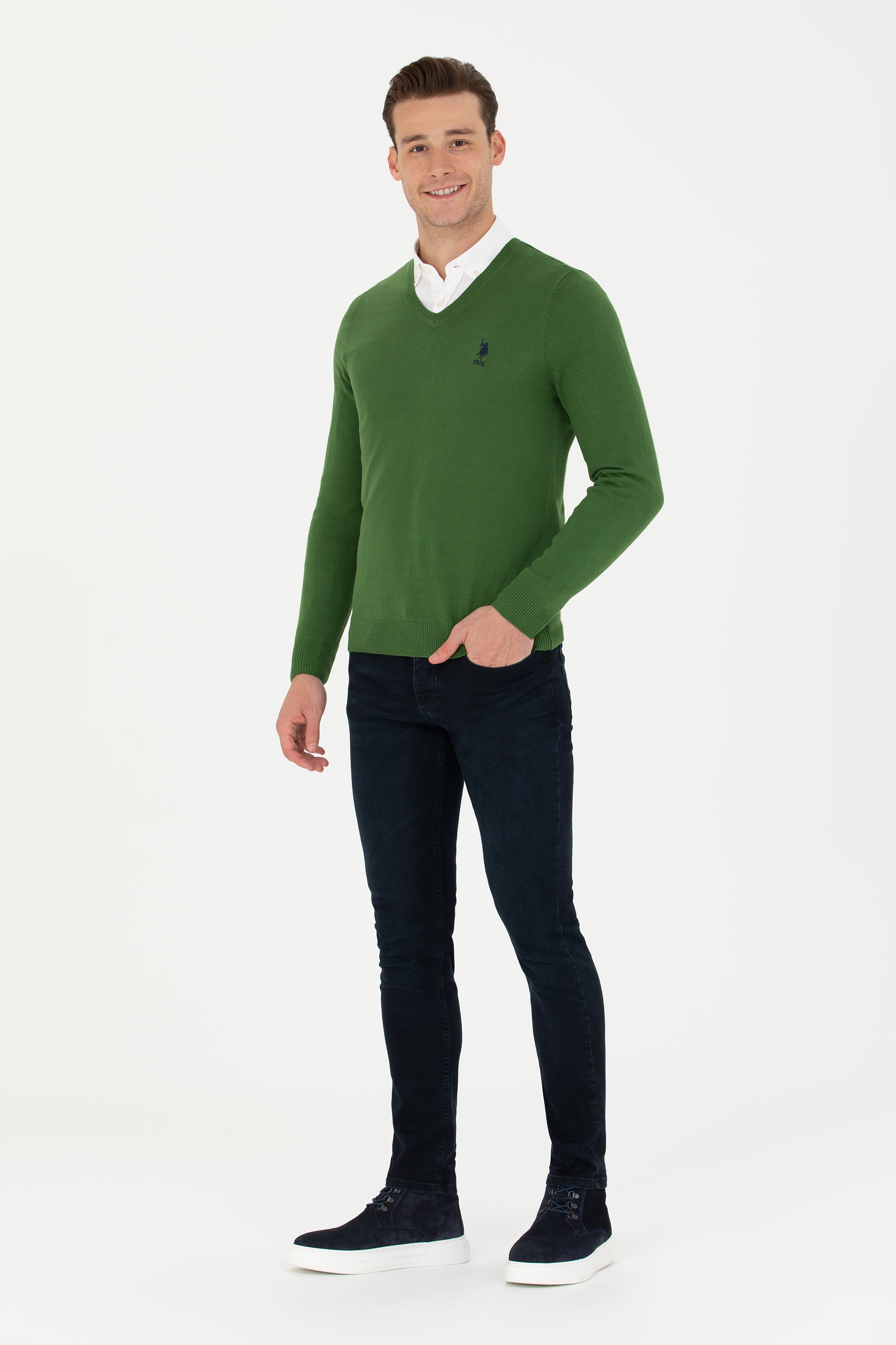 Muški zeleni džemper predstavlja spoj udobnosti i casual stila. Karakteriše ga jednostavan dizajn sa V-izrezom i finim rebrastim detaljima na rubovima rukava i donjem delu džempera. Izrađen je od mekog materijala koji obezbeđuje toplotu i komfor, čineći ga savršenim izborom za svakodnevno nošenje. Džemper je uparen sa belom košuljom ispod, što dodaje notu formalnosti i čini ga pogodnim za poslovne i poluformalne prilike. Može se kombinovati sa različitim vrstama pantalona, od džinsa do chino pantalona, za različite izglede.