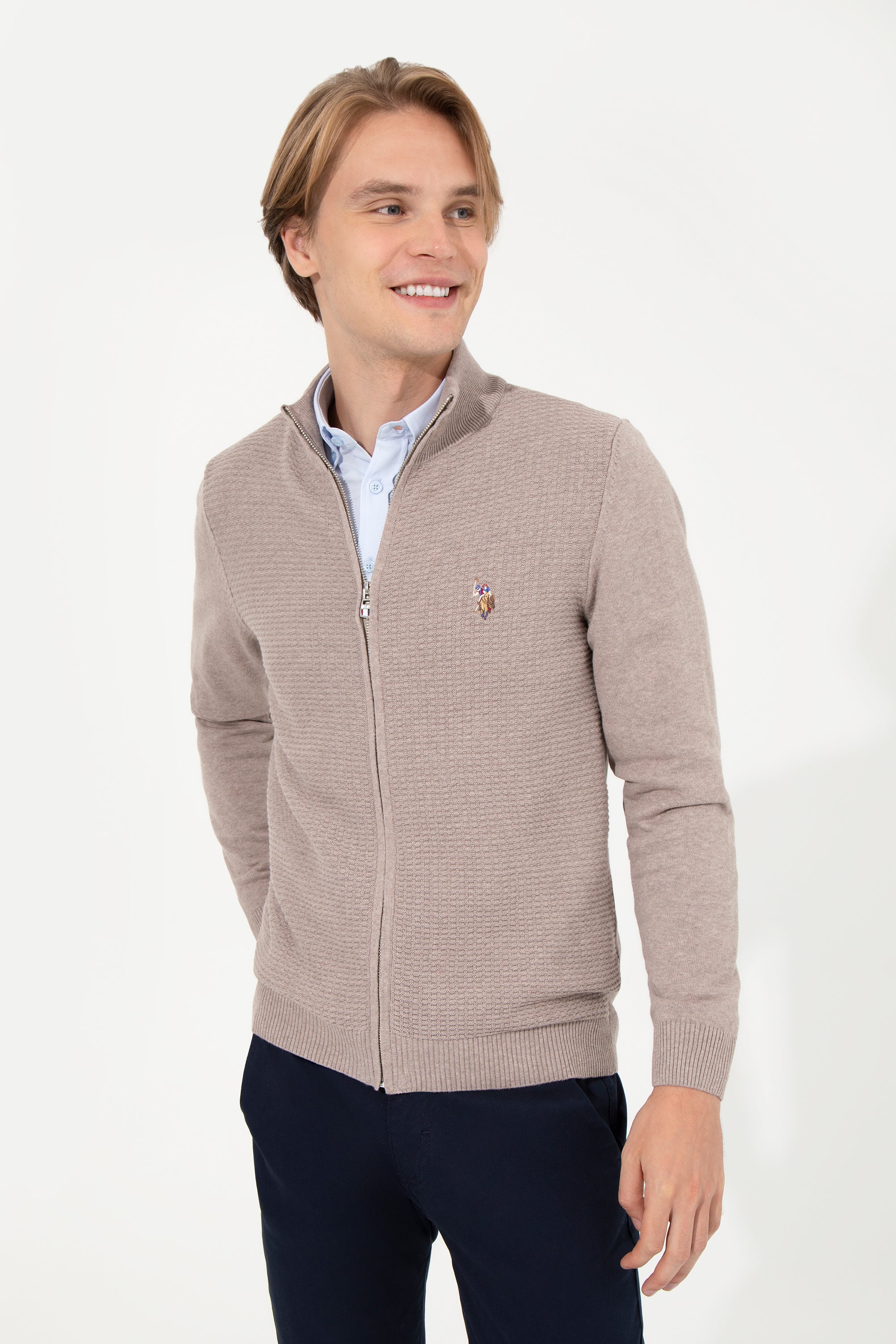 Elegantan muški džemper u neutralnoj bež boji pruža idealnu kombinaciju comforta i stila u različitim prilikama. Izrađen je od kvalitetnog materijala koji obezbeđuje toplotu, dok njegova fina tekstura pletiva doprinosi klasičnom izgledu. Džemper ima visoku kragnu i zatvarač do pola koji omogućava jednostavno oblačenje i skidanje, pritom dodajući moderni šik. Rebrasti završeci na rukavima i donjem delu džempera osiguravaju savršeno prileganje i sprečavaju prodor hladnog vazduha. Dizajniran je tako da se lako može kombinovati sa poslovnim košuljama ili casual majicama, savršen je za dnevne poslovne sastanke, ali i opuštene aktivnosti. Discretni logo na grudima daje prepoznatljiv pečat brenda, obezbeđujući dodir luksuza.