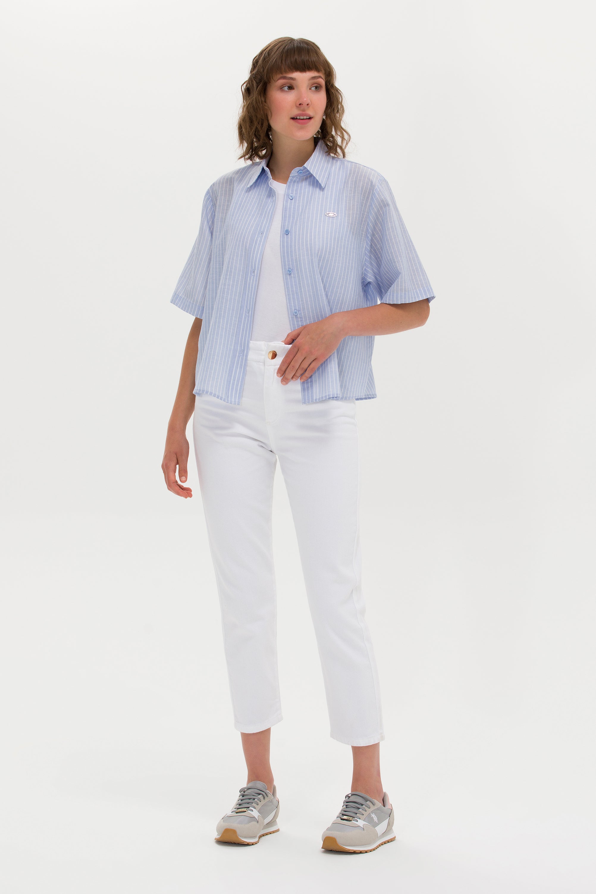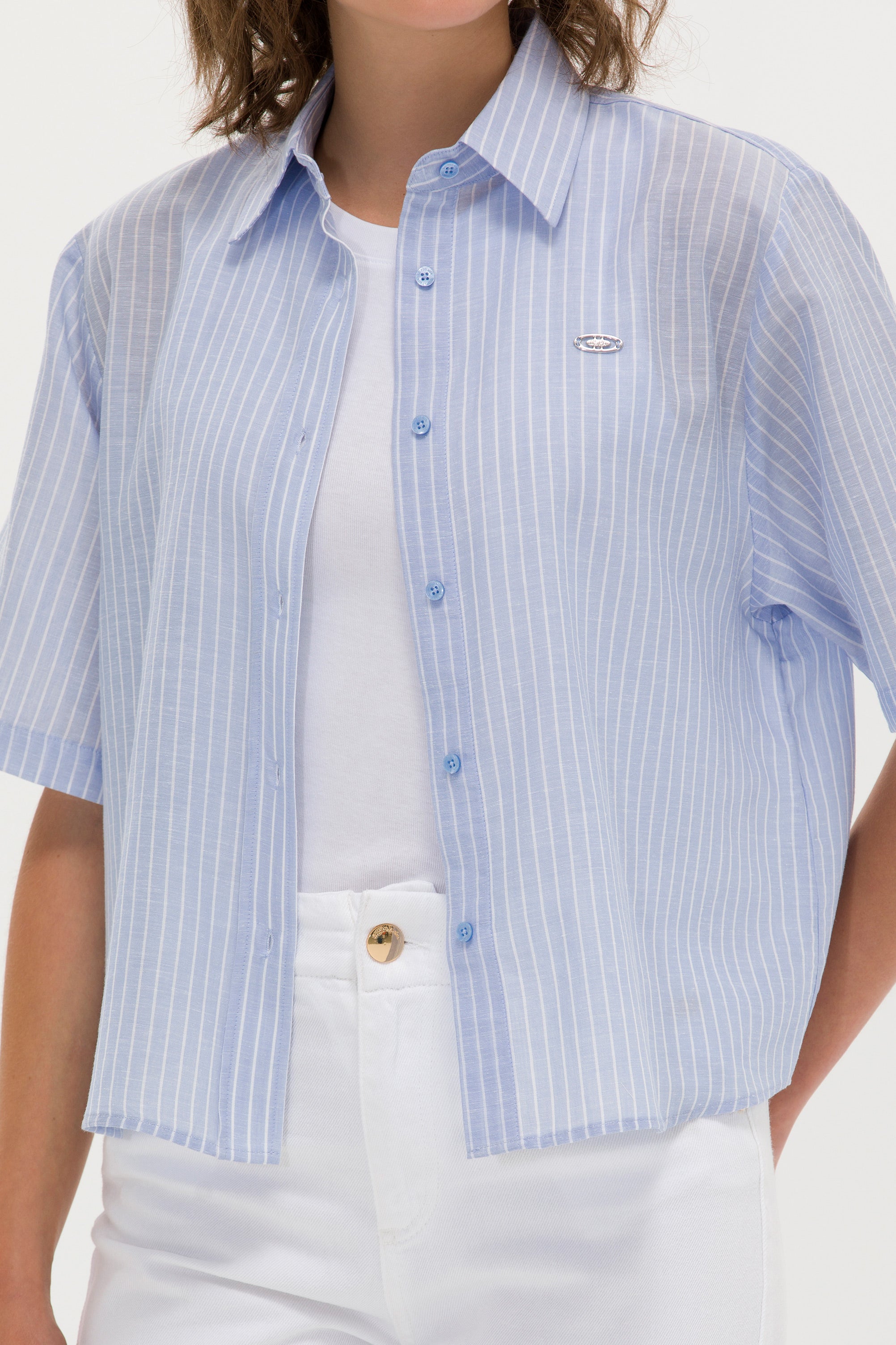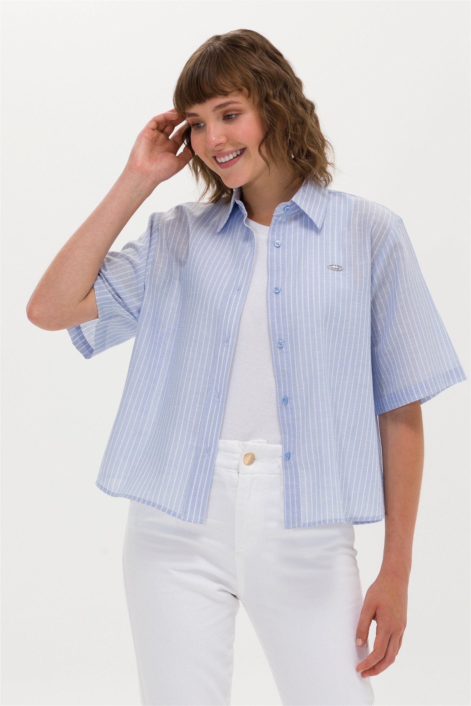 Elegantna ženska košulja sa širokim prugama u klasičnoj kombinaciji plave i bele pruža sofisticiran izgled u svakoj prilici. Izrađena od laganih i prozračnih materijala obezbeđuje konfor i lakoću nošenja tokom celog dana. Ovaj model karakteriše ravan kroj sa kratkim rukavima koji doprinosi opuštenom stilu, dok klasična kragna i prozračni materijal omogućavaju eleganciju i funkcionalnost. Na prednjem delu se nalazi decentno dizajnirana dugmad, a mali logotip brenda dodaje notu prepoznatljivosti. Ova košulja je idealna za poslovne kombinacije uz suknje i pantalone visokog struka, ali takođe i za casual varijante sa farmerkama ili šortsom.