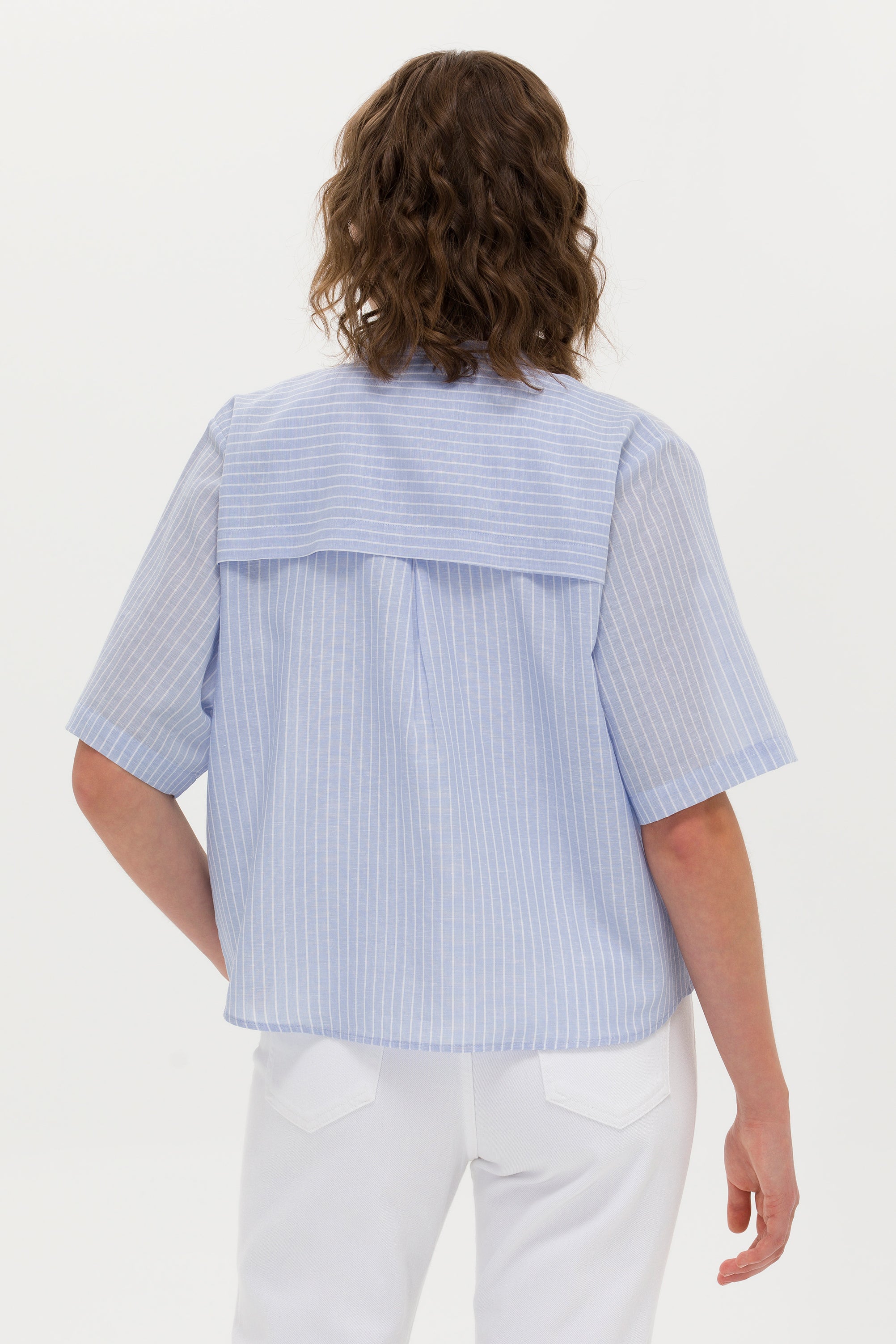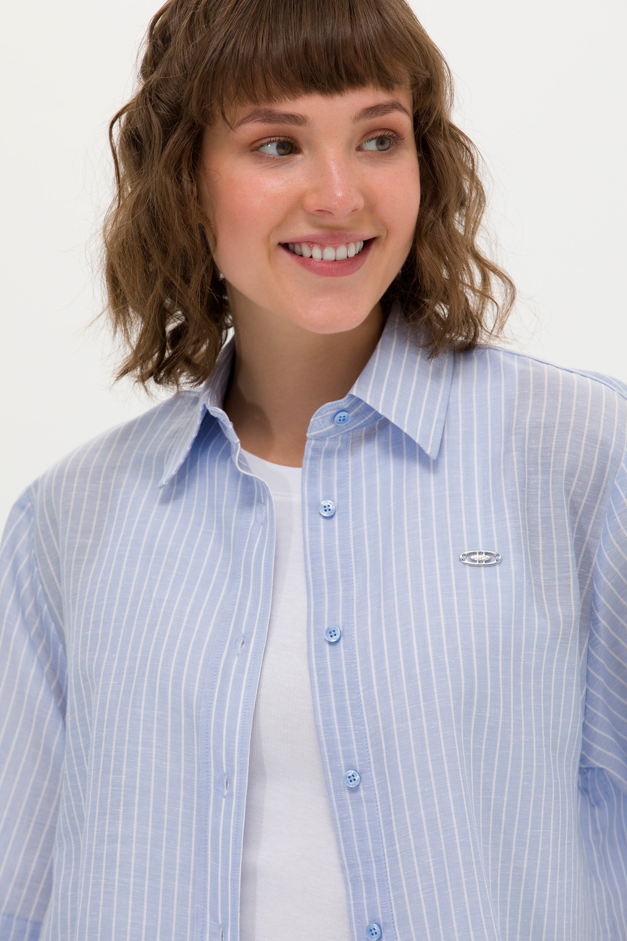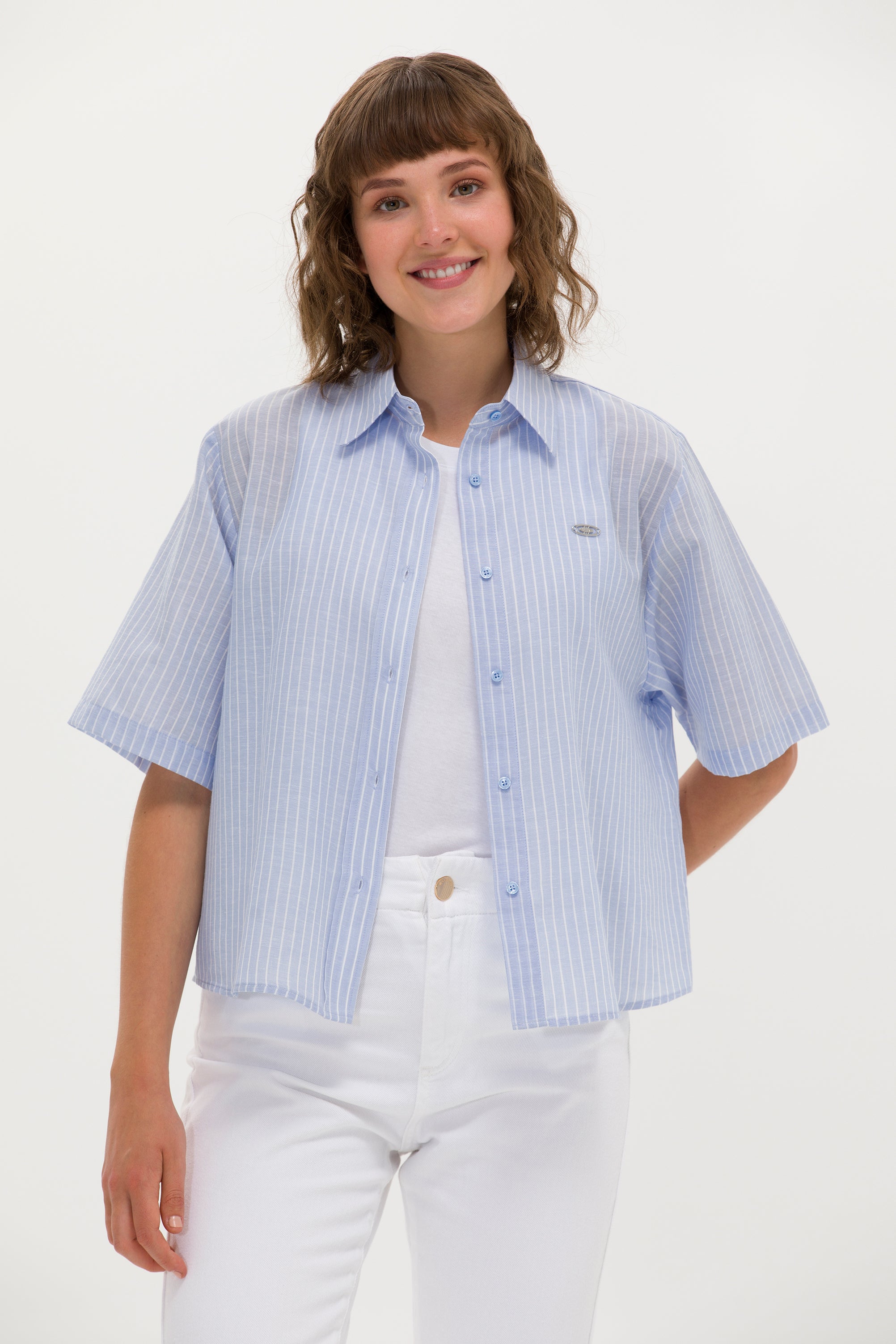 Elegantna ženska košulja sa širokim prugama u klasičnoj kombinaciji plave i bele pruža sofisticiran izgled u svakoj prilici. Izrađena od laganih i prozračnih materijala obezbeđuje konfor i lakoću nošenja tokom celog dana. Ovaj model karakteriše ravan kroj sa kratkim rukavima koji doprinosi opuštenom stilu, dok klasična kragna i prozračni materijal omogućavaju eleganciju i funkcionalnost. Na prednjem delu se nalazi decentno dizajnirana dugmad, a mali logotip brenda dodaje notu prepoznatljivosti. Ova košulja je idealna za poslovne kombinacije uz suknje i pantalone visokog struka, ali takođe i za casual varijante sa farmerkama ili šortsom.