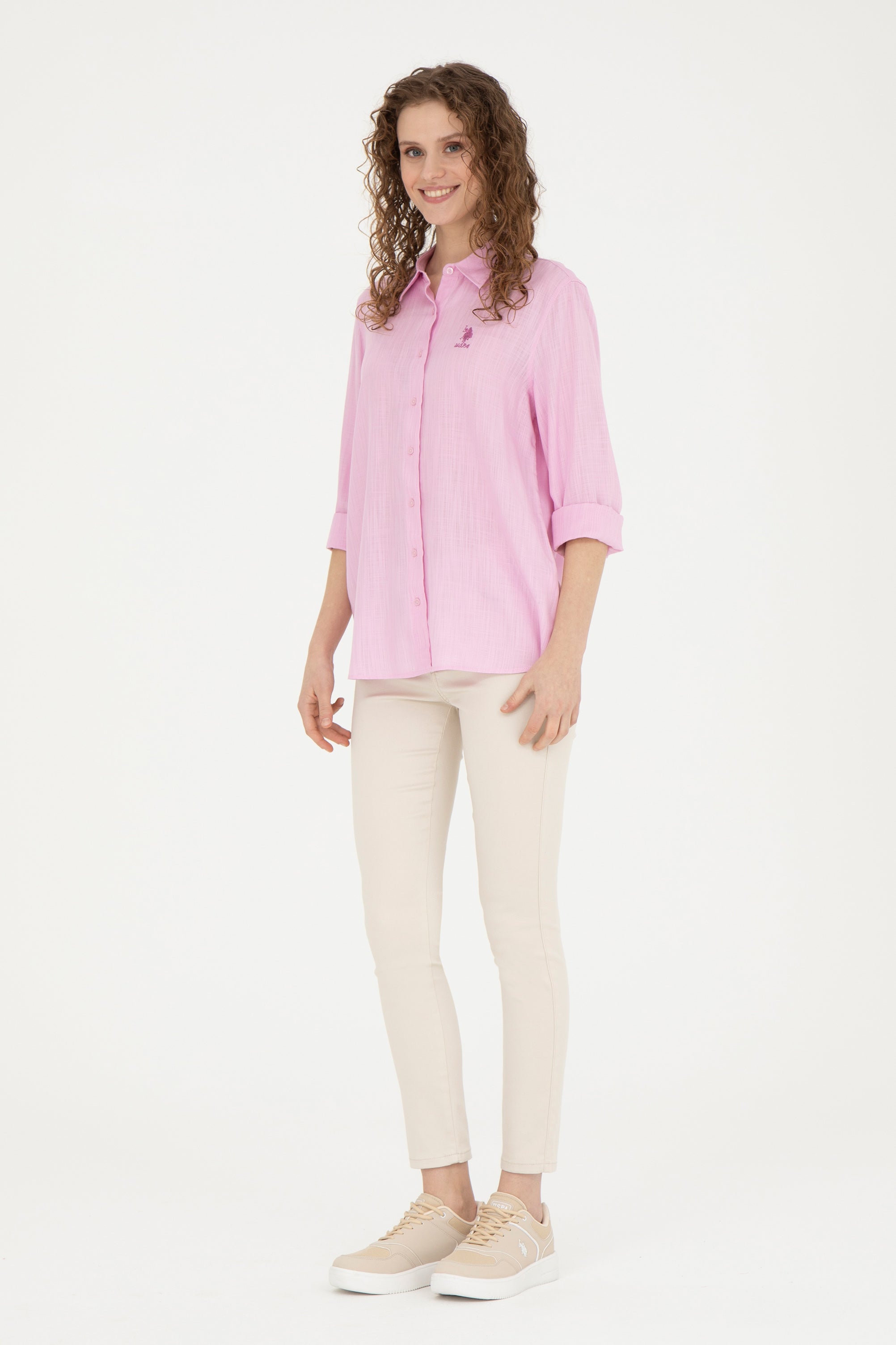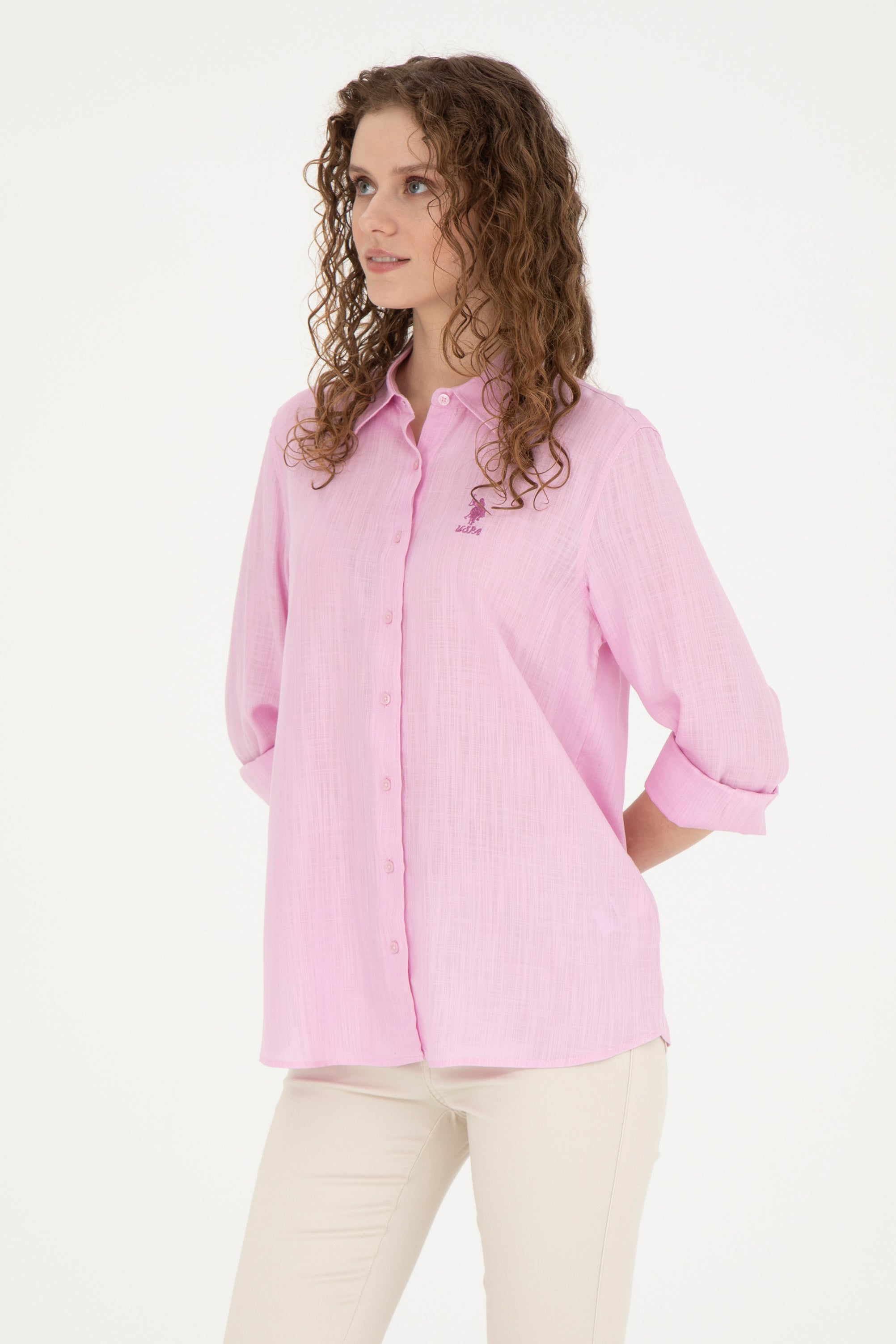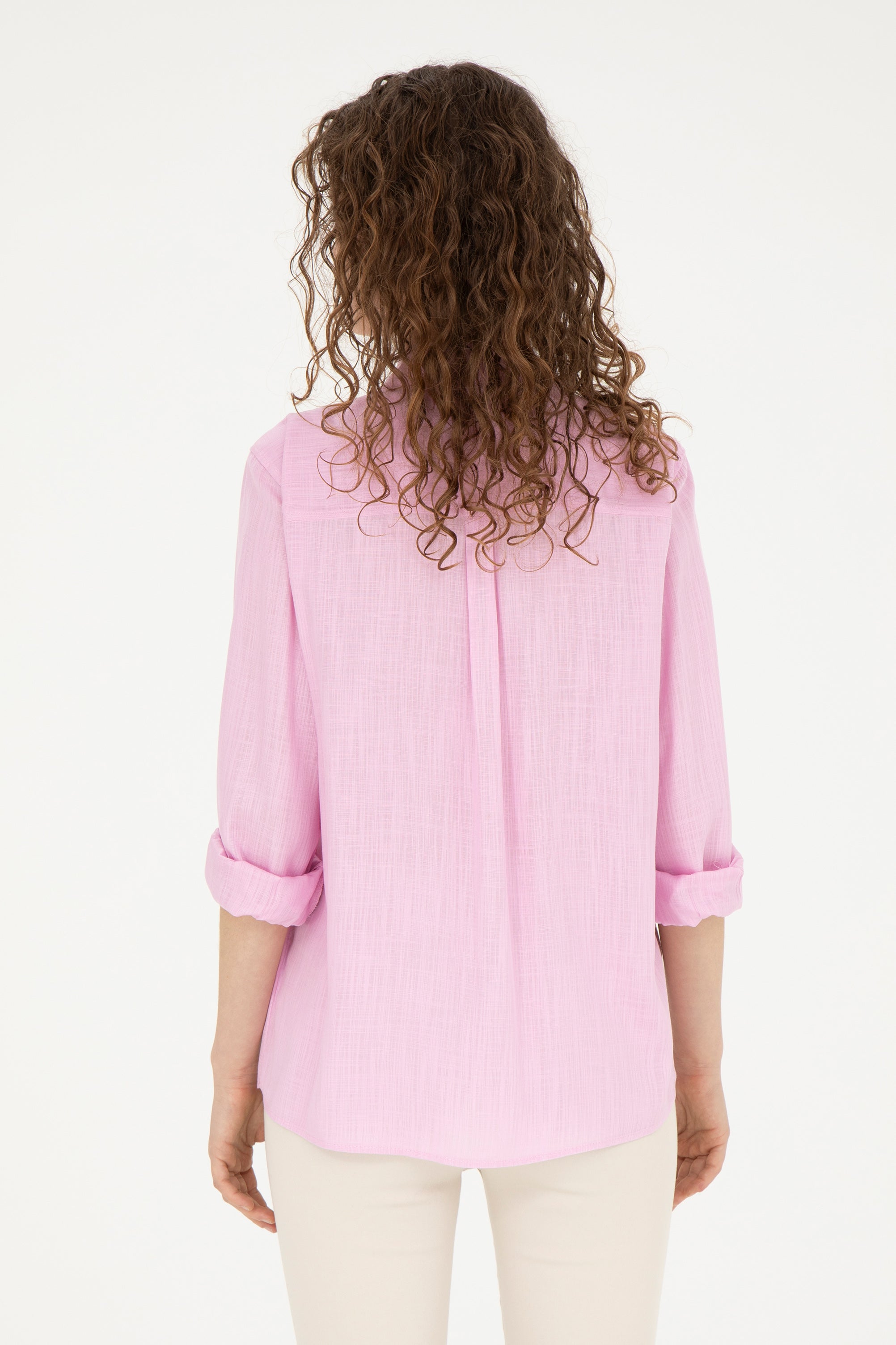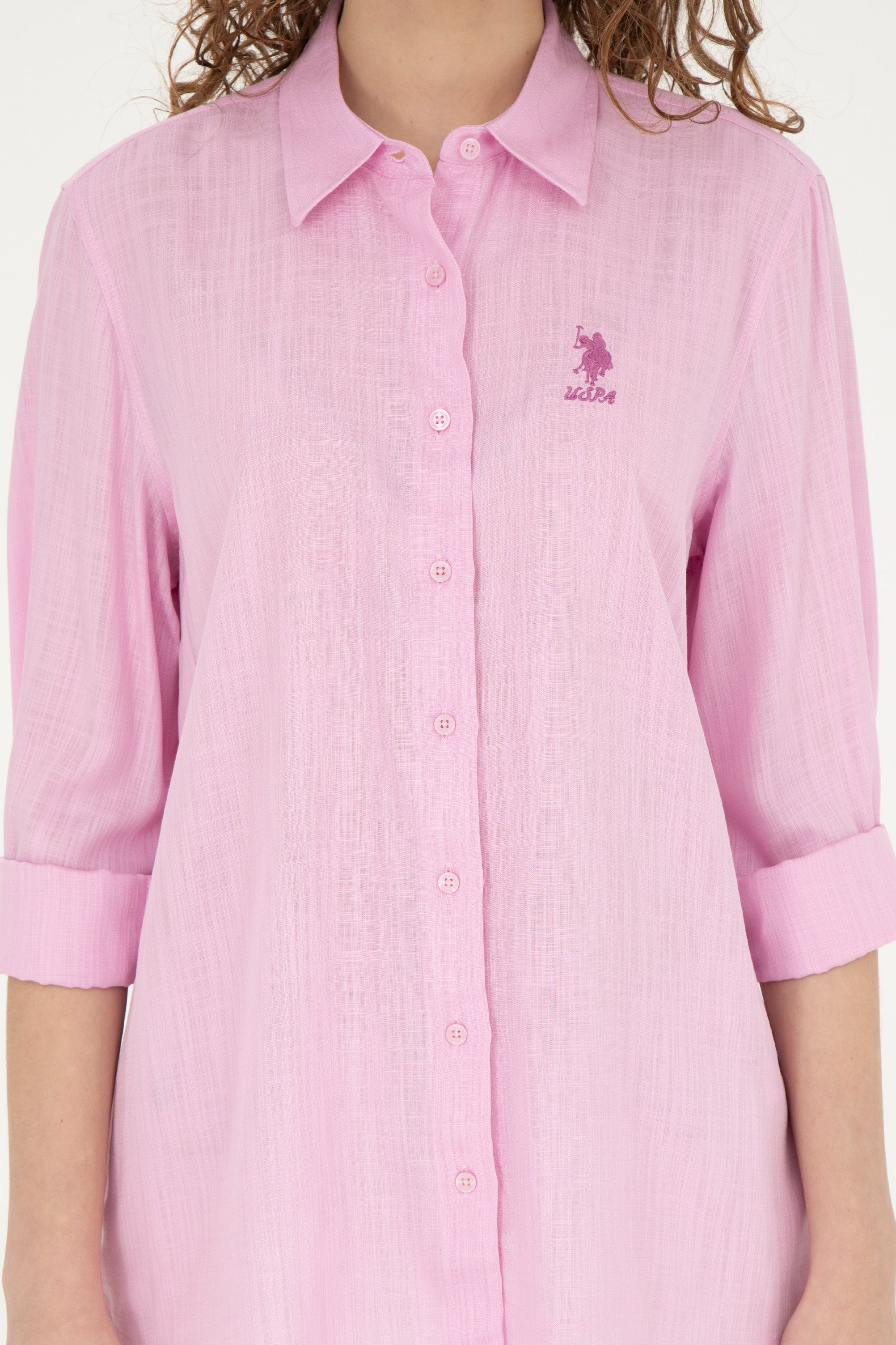 Elegantna košulja dugih rukava u pastelno roze boji pruža kombinaciju udobnosti i sofisticiranog izgleda; karakteriše je nežna tekstilna struktura sa diskretnim vertikalnim prugama koje doprinose vizuelnoj dinamici. Na levoj strani grudi ističe se simpatičan vez kao upečatljiv detalj. Košulja ima klasičan kroj sa zakopčavanjem napred i može se nositi u raznim prilikama, od poslovnih sastanaka do neformalnih druženja, te odlično pristaje uz elegantne pantalone ili casual farmerke, što je čini svestranim komadom u garderobi.