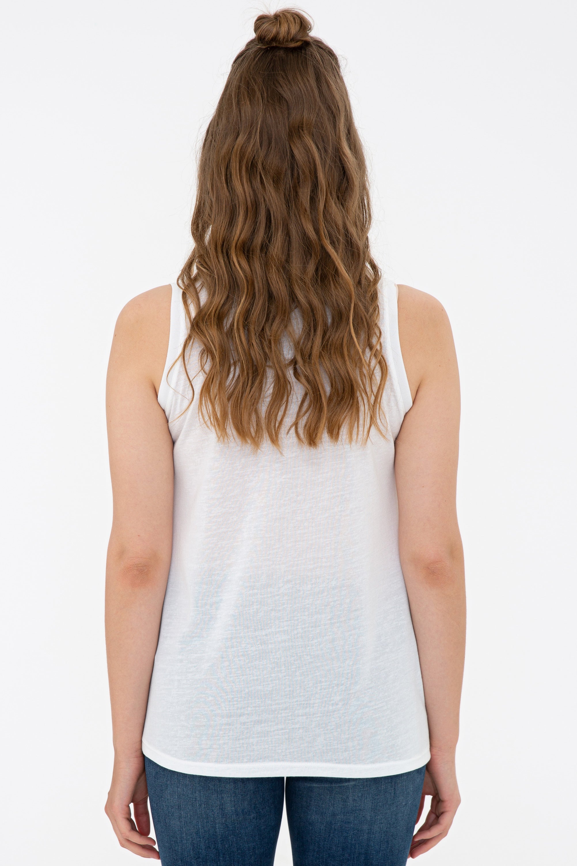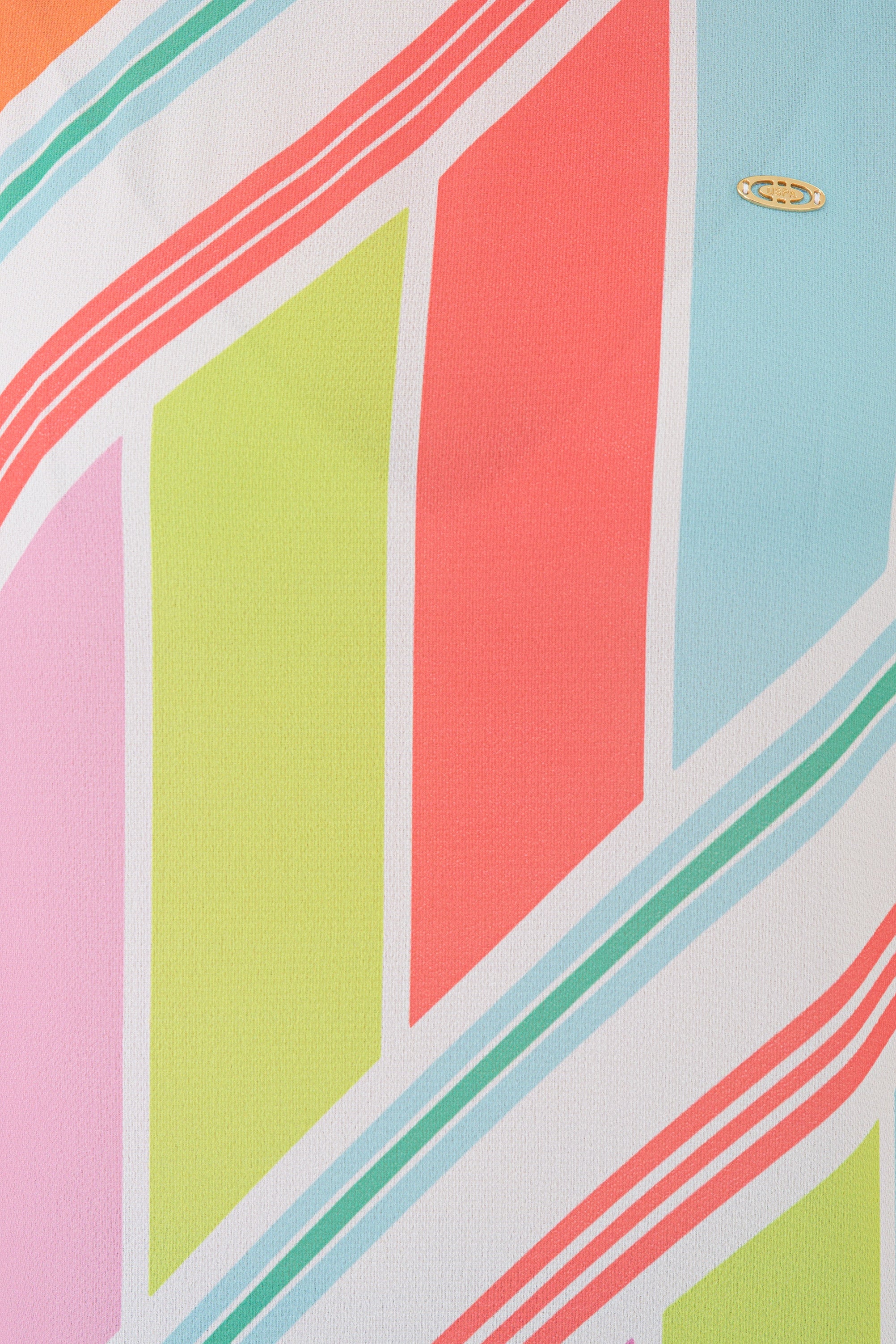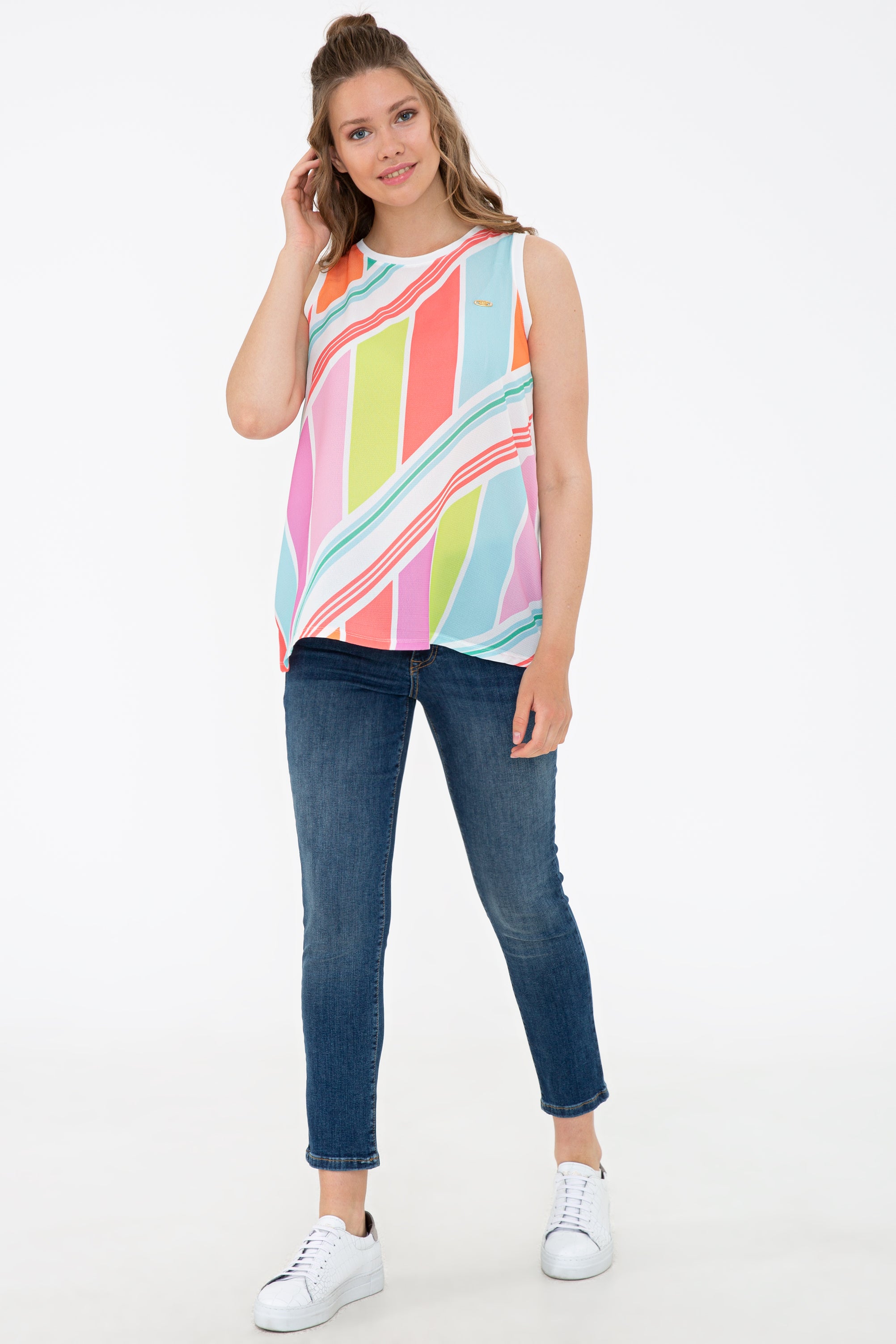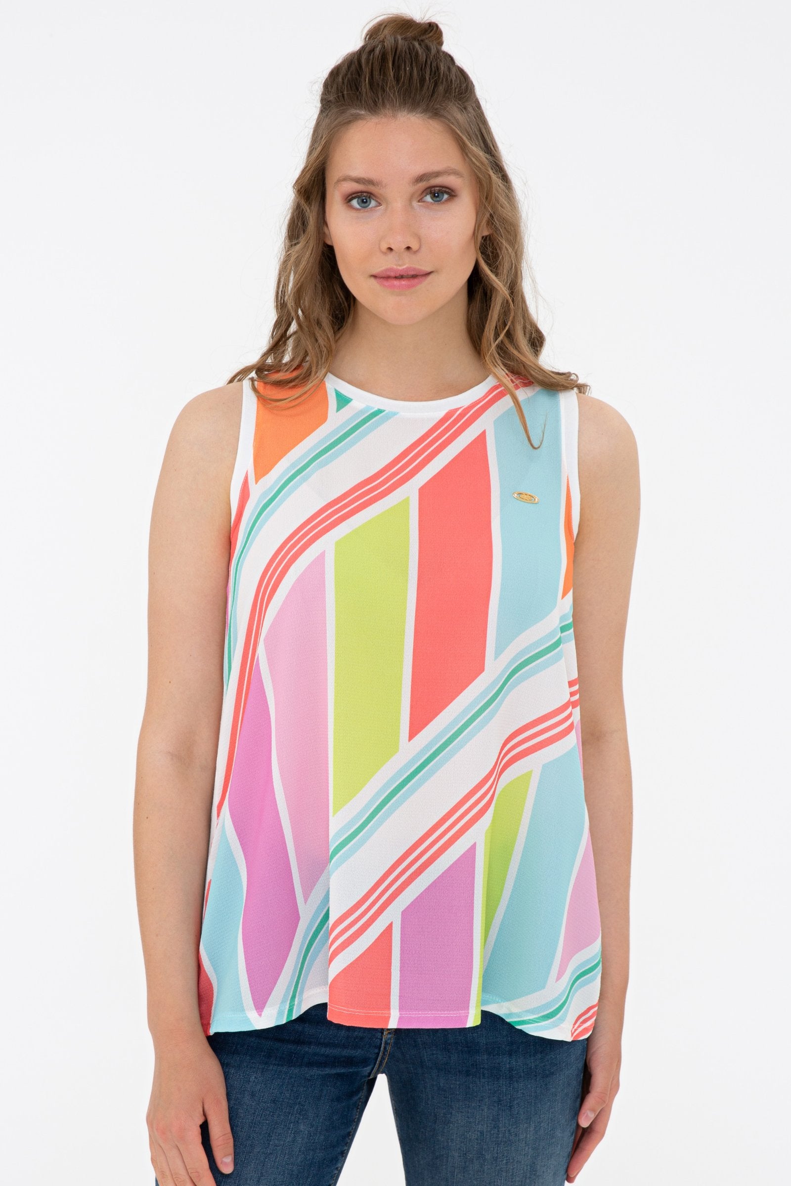 Živopisna majica bez rukava za žene donosi pravo osveženje u svakodnevnom stilu svojim smelim šarama u kontrastnim bojama koje uključuju ružičastu, zelenu, narandžastu i belu. Dizajn majice je moderan, sa ravnim izrezom oko vrata koji pruža jednostavnost i sofisticirani izgled. Izrađena je od laganog materijala koji obezbeđuje komfor i prozračnost tokom toplijih dana. Ova majica je savršen izbor za razne prilike, od opuštenih druženja do poslovnih sastanaka, kada se kombinuje sa blazerom ili elegantnim pantalonama.