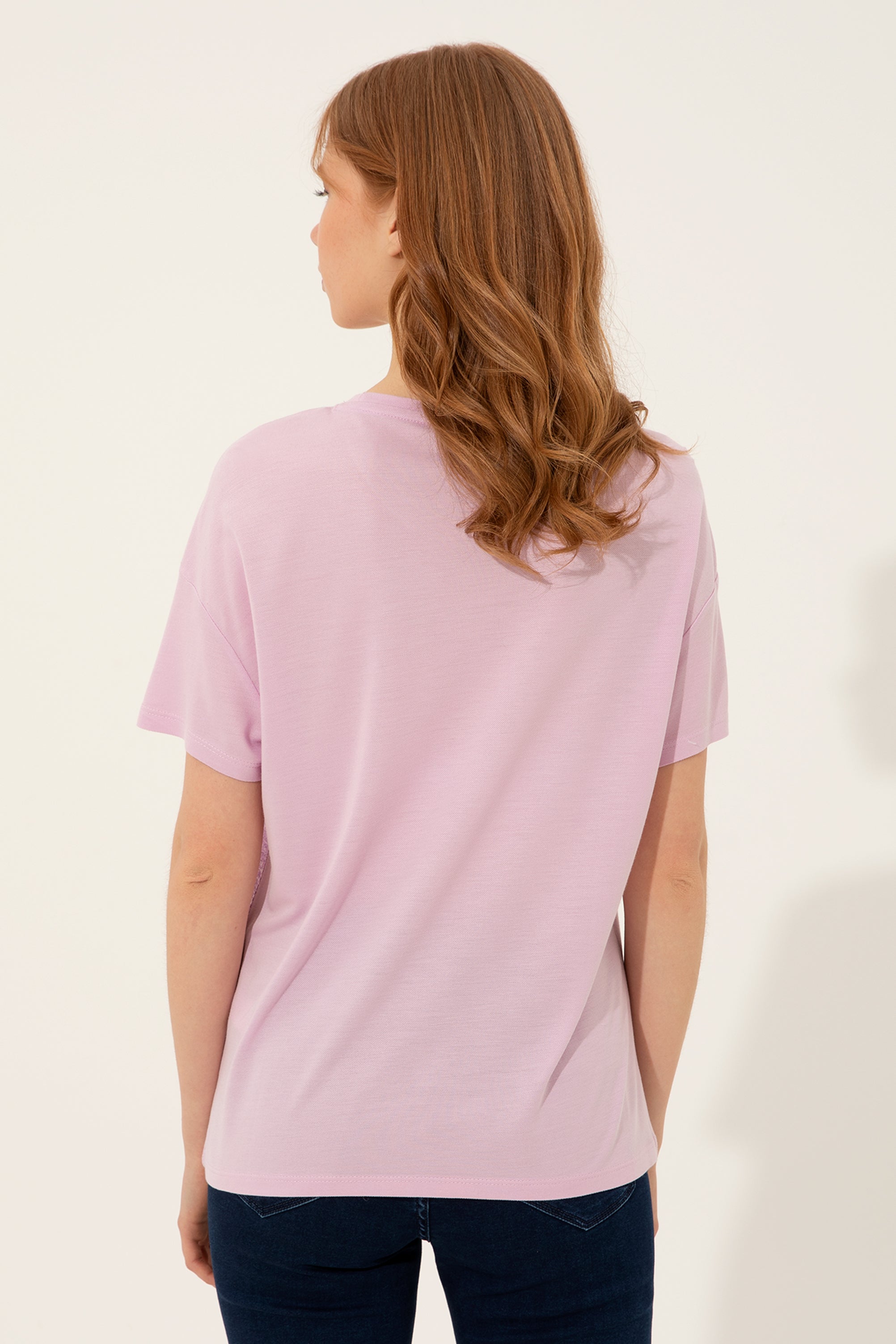 Ležerna roze majica sa kratkim rukavima predstavlja spoj udobnosti i jednostavnog stila. Karakteriše je opušteni kroj koji pruža slobodu pokreta, čineći je idealnom za svakodnevno nošenje. Na prednjoj strani ističe se veliki natpis u ljubičastoj boji, koji dodaje sportski šarm ovom komadu odeće. Izrađena od mekog i prozračnog materijala, ova majica je savršena za tople dane. Može se kombinovati sa različitim donjim delovima, kao što su farmerke ili šorts, za opušteni, ali stilizovani izgled.