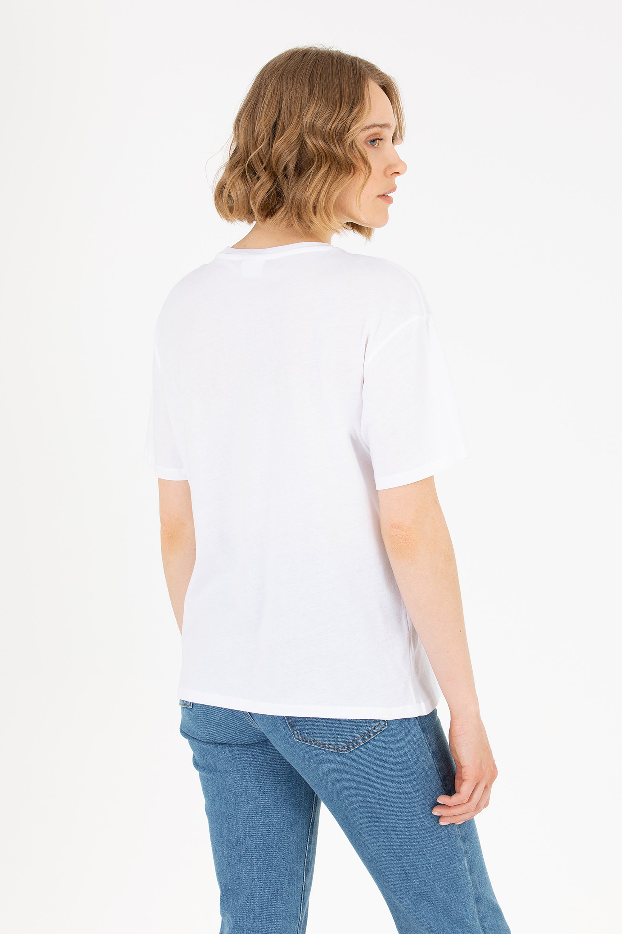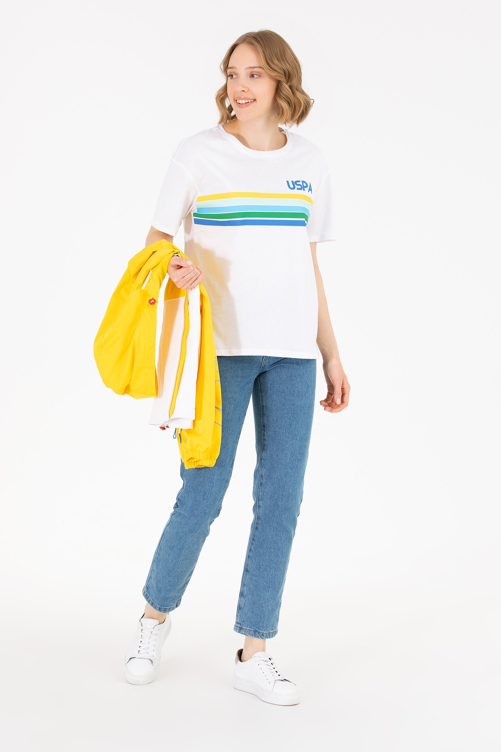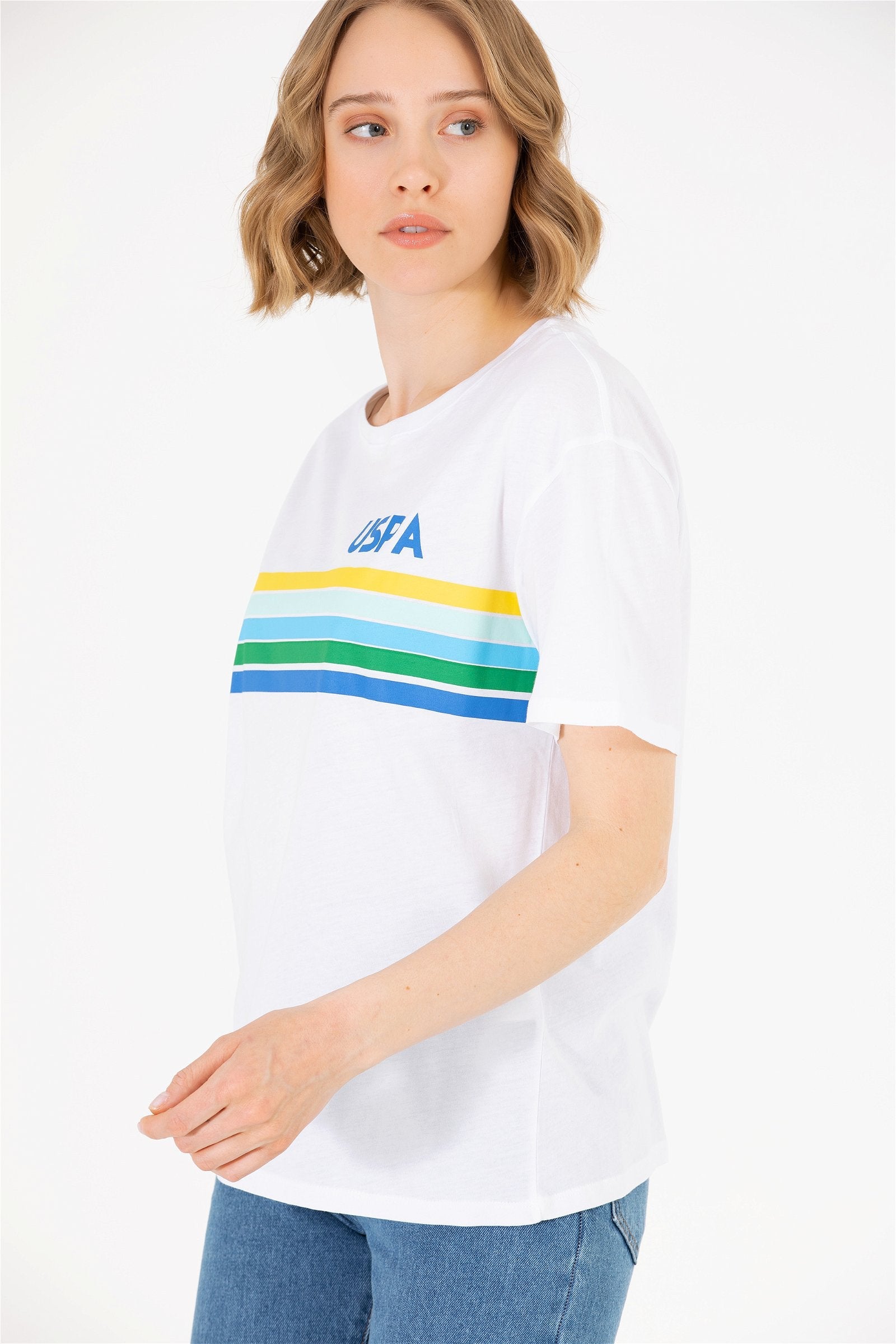 Moderna majica kratkih rukava u beloj boji osvežena je sa horizontalnim prugama u živopisnim bojama koje joj daju sportsku eleganciju. Izrađena je od kvalitetnog pamuka koji obezbeđuje udobnost i prozračnost tokom nošenja. Kratki rukavi i okrugli izrez čine je idealnom za svakodnevne prilike, bilo da se kombinuje sa farmerkama ili suknjom. Na prednjoj strani majice nalazi se diskretni logotip koji doprinosi njenom prepoznatljivom dizajnu. Ova majica je odličan izbor za dame koje cene udobnost ali i moderan izgled u raznim prilikama.