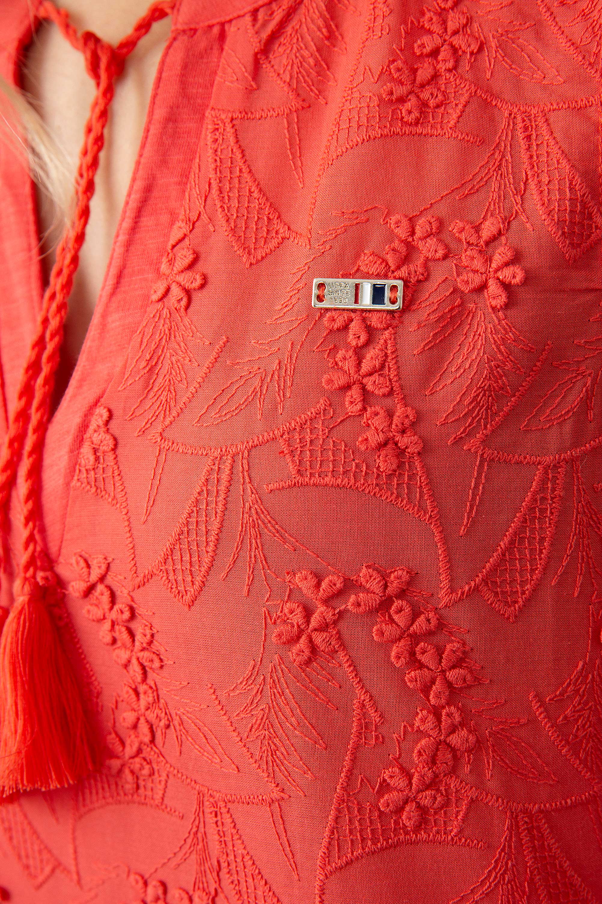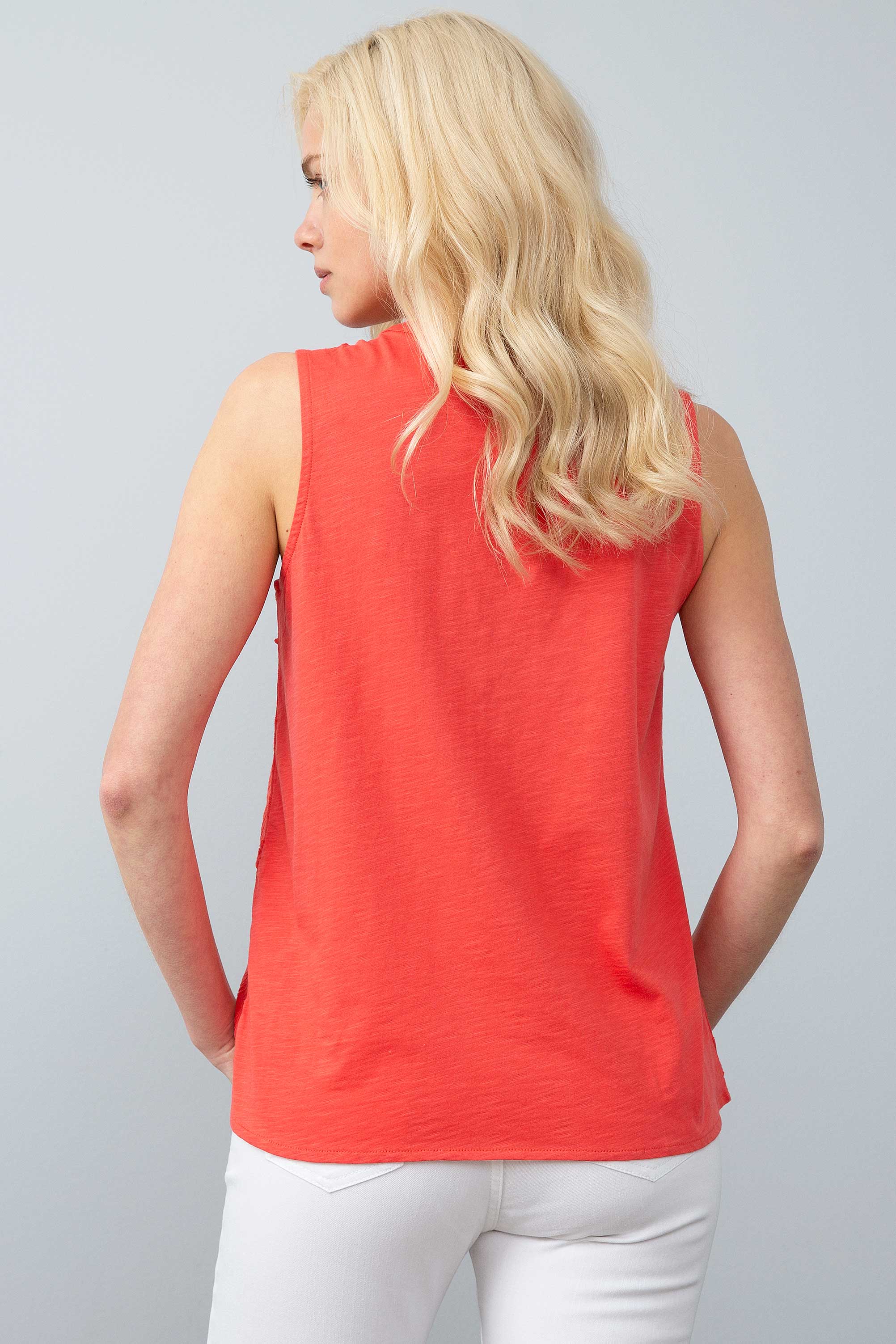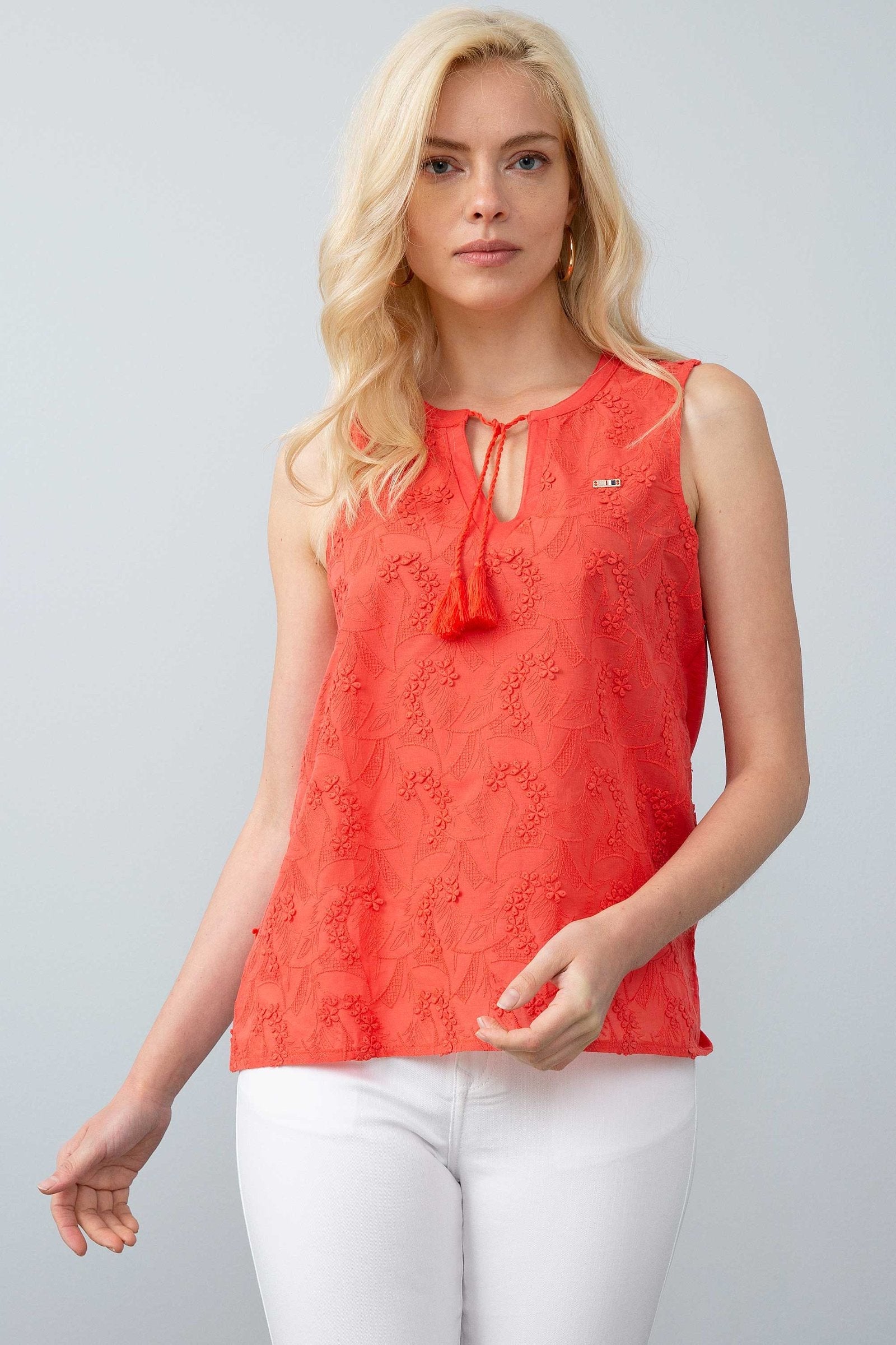 Ženstvena majica bez rukava u vibrantnoj koralno crvenoj boji pruža osećaj svežine i elegancije u svakodnevnom stajlingu. Karakterišu je delikatni čipkani detalji i lagani materijal koji omogućava koži da diše, čineći je idealnom za tople dane. Majica ima graciozni V-izrez sa ukrasnim vezicama koje dodaju dašak ženstvenosti. Ova majica je univerzalan komad koji se lako kombinuje sa raznim donjim delovima, kao što su suknje, kratke ili duge pantalone, te predstavlja sofisticirani izbor za različite prilike.