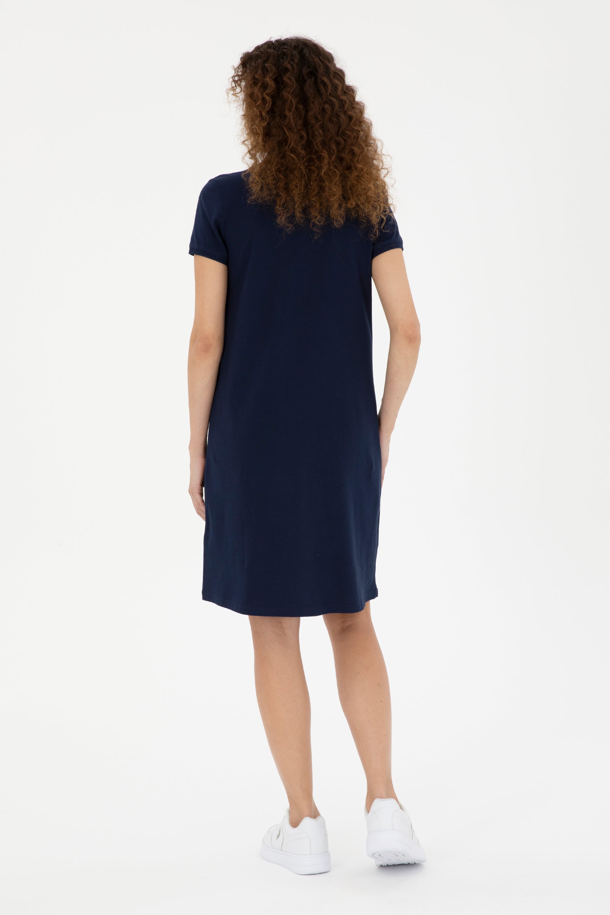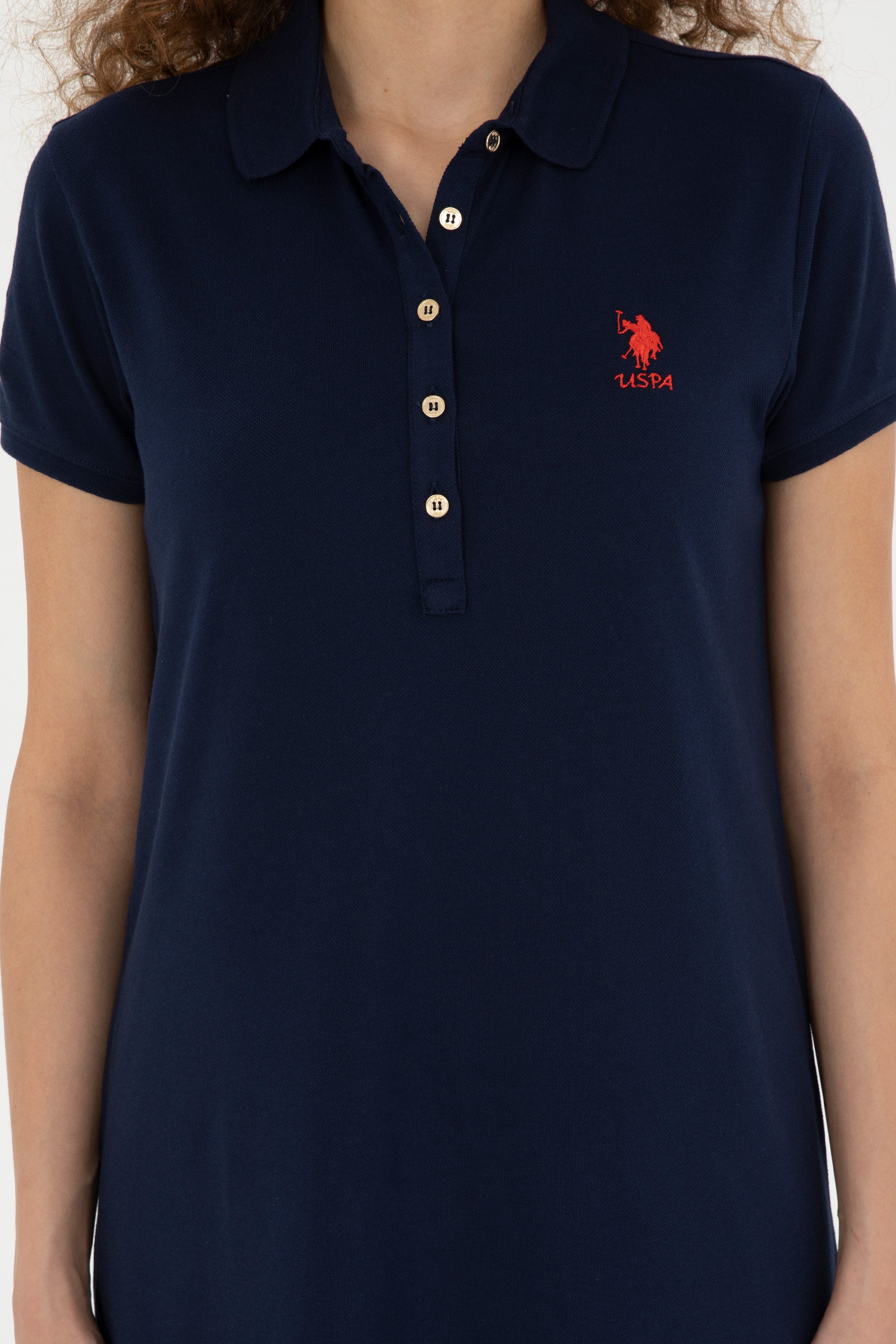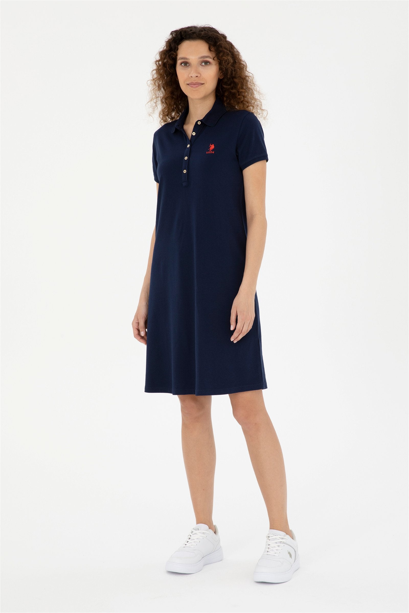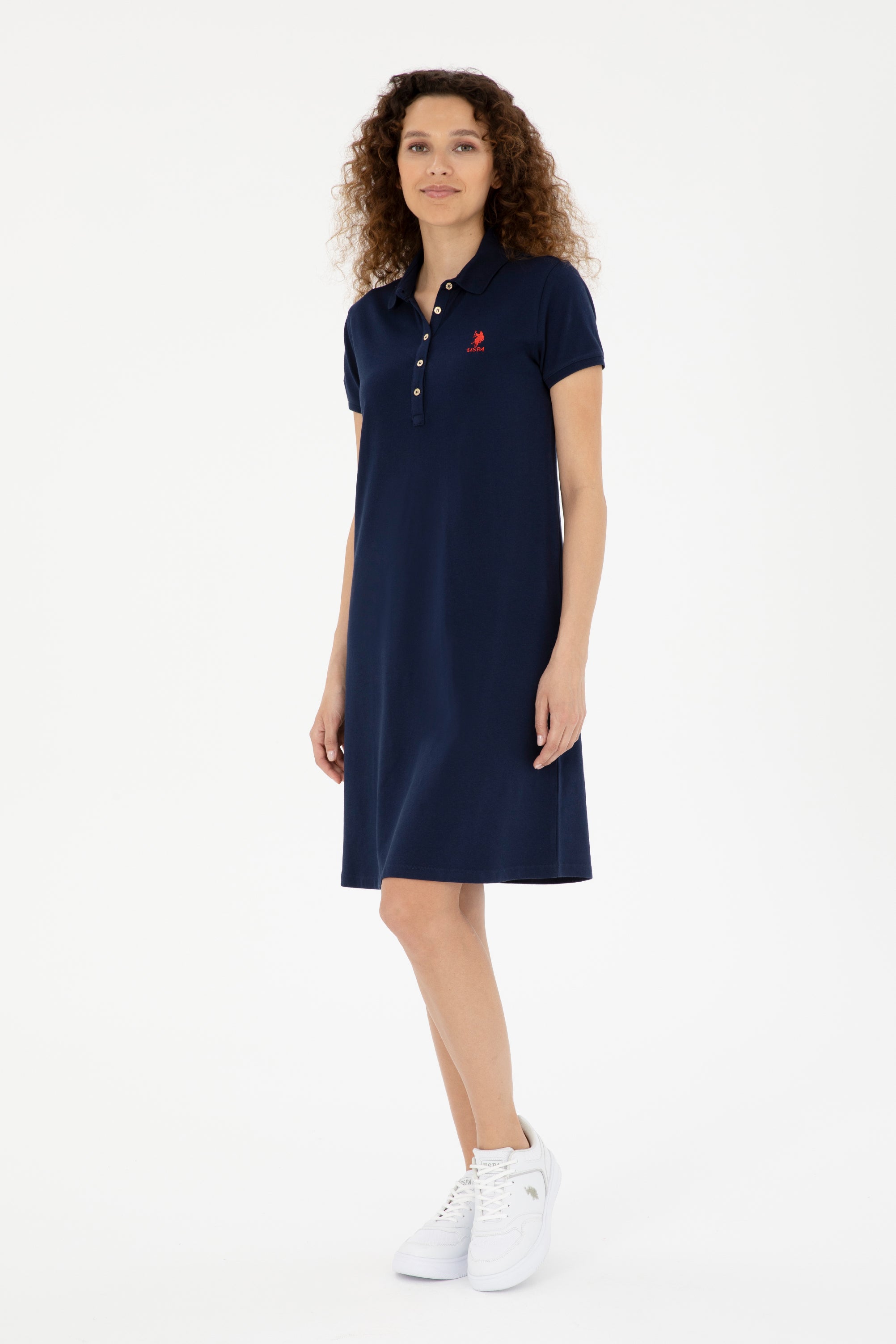 Elegantna polo haljina klasičnog kroja u tamno plavoj boji idealan je izbor za kombinovanje udobnosti i stila. Odlikuje je mekani pamučni materijal koji pruža osećaj lakoće pri nošenju, dok klasičan polo ovratnik sa tri dugmeta doprinosi sofisticiranom izgledu. Na grudima se ističe suptilni vezani logo koji dodaje prepoznatljiv brendirani akcenat. Zahvaljujući A-liniji kroja, ova haljina lepo pada i pruža slobodu pokreta, čineći je savršenim izborom za dnevne aktivnosti. Može se nositi sa sportskom obućom za opušteni look ili sa elegantnim sandalama za večernje prilike.