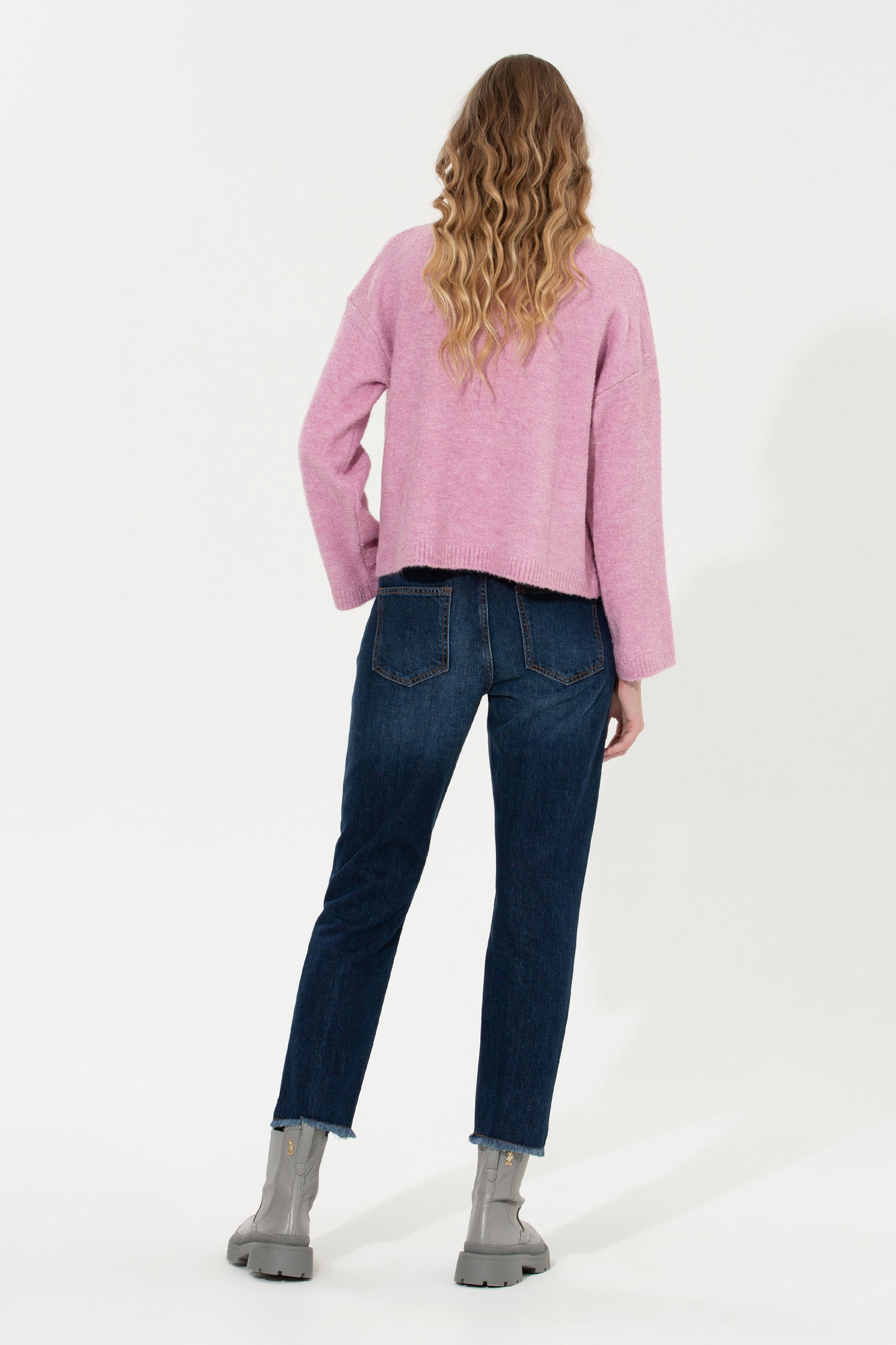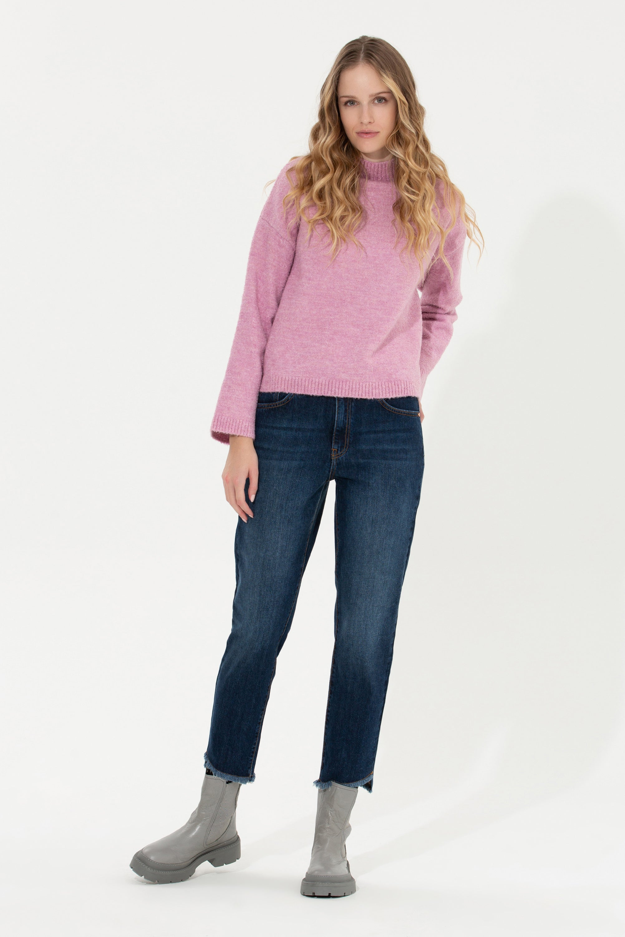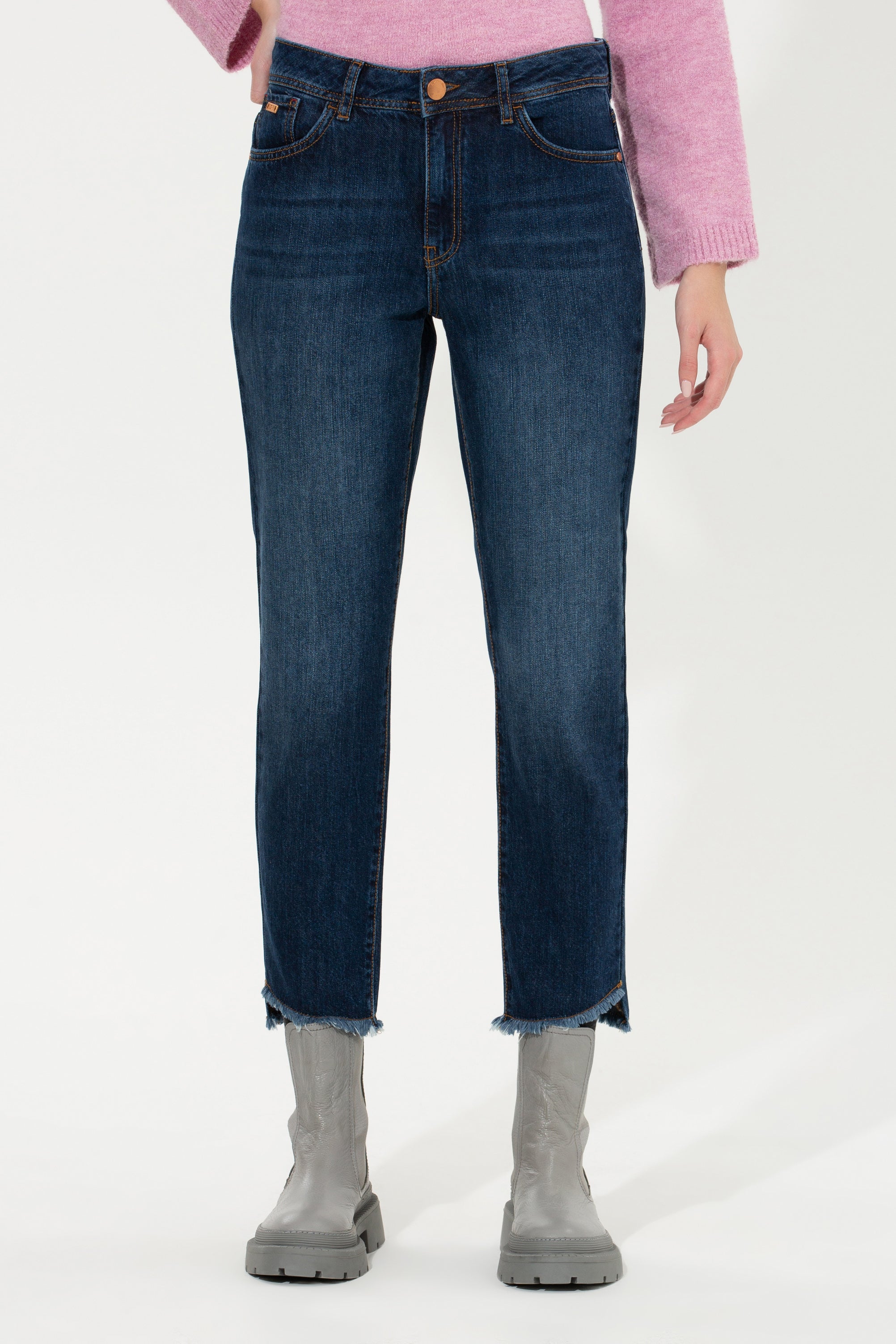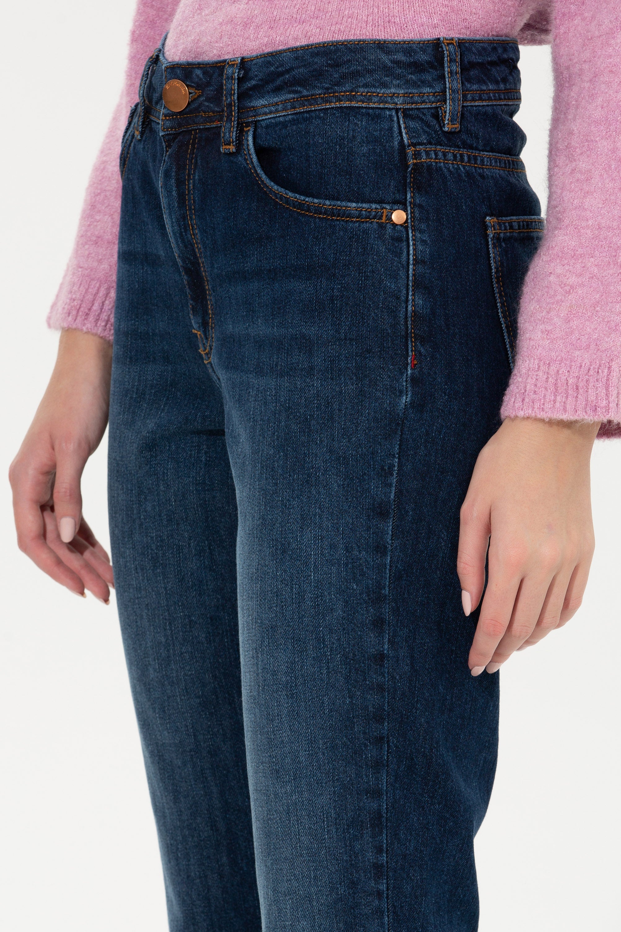 Klasične farmerke visokog struka u tamno plavoj nijansi su osnovni komad u svakoj garderobi, nudeći funkcionalnost i višestranost za svaku priliku. Izrađene od čvrstog denim materijala, karakteriše ih izdržljivost i sposobnost da oblikuju figuru, obezbeđujući istovremeno udobnost zahvaljujući blagom elastinu. Pramenovi na rubovima nogavica dodaju moderni pečat, što čini ove farmerke savremenim izborom za casual izgled. Dizajnirane sa pet džepova i standardnim zatvaranjem na dugme i šlic, lako se kombinuju sa različitim vrstama obuće i gornjih delova odeće, poput majica, bluza i džempera, nudeći bezbroj mogućnosti za svakodnevne i večernje stajlinge.