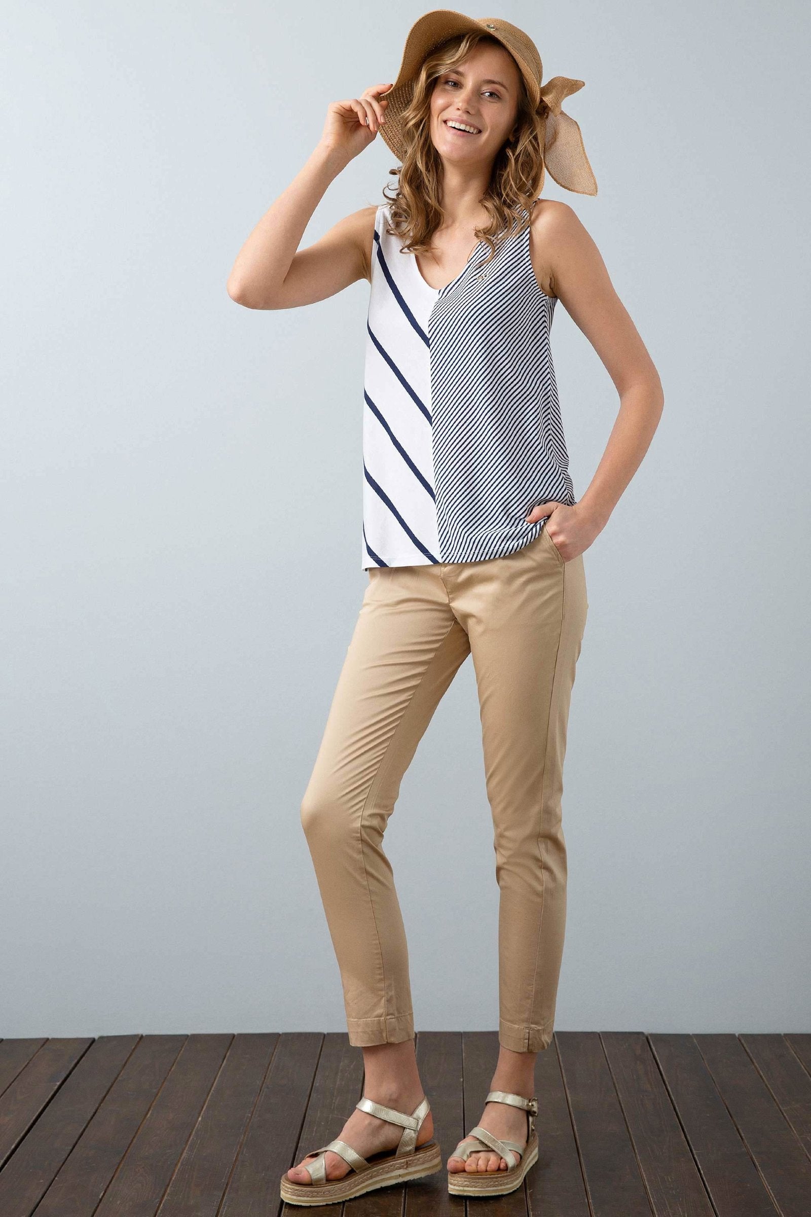 Elegantne ženske pantalone u nežnoj bež boji spajaju klasičan stil i savremen dizajn, nudeći komfor i sofisticiranost. Izrađene su od kvalitetnog materijala koji pruža prijatan osećaj na koži i omogućava lakoću pokreta. Ove pantalone imaju ravan kroj koji prati liniju tela, a pružaju slobodu i udobnost tokom nošenja. U struku su opremljene praktičnim pojasom koji ističe figuru i dodaje dozu elegancije, dok se na prednjem dijelu nalaze decentni džepovi za dodatnu funkcionalnost. Pantalone se lako kombinuju sa različitim vrstama gornjih delova i idealne su za poslovne prilike, ali i za opuštene dnevne varijante.