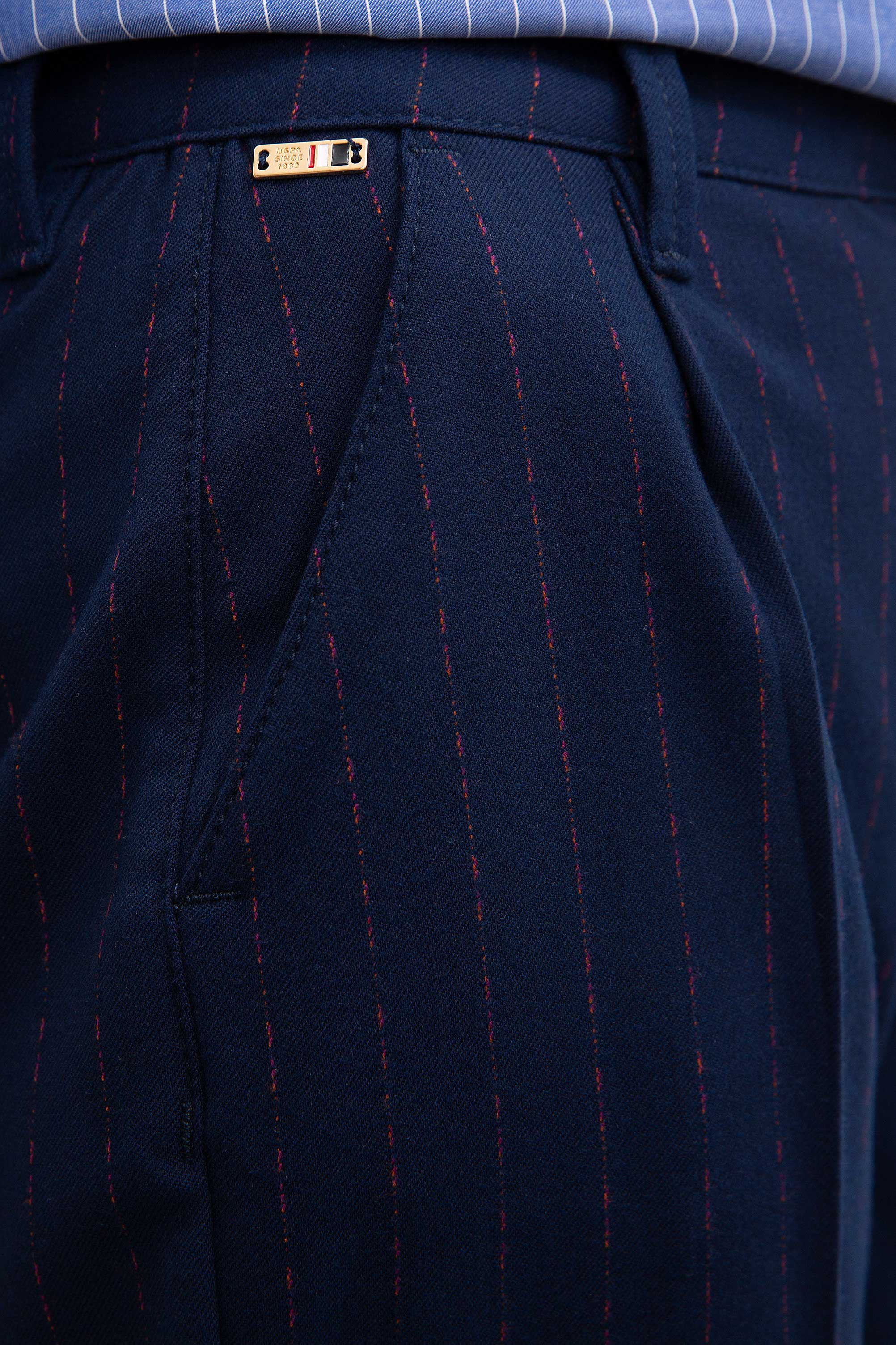 Sofisticirane pantalone klasičnog kroja u tamnoplavoj boji sa elegantnim prugama nude kombinaciju udobnosti i stila za poslovne ili svečane prilike. Izrađene su od kvalitetnog materijala koji omogućava lako održavanje i dugotrajnost. Visoki struk sa tankim kaišem naglašava figuru, dok blago širok kroj nudi slobodu pokreta. Prednji deo pantalona krasi diskretni drapirani detalj, što ih čini unikatnim. Ove pantalone se lako mogu kombinovati sa košuljama ili bluzama za elegantan izgled, a odgovaraju i uz obuću različitih stilova - od salonki do patika, pružajući višestranost za razne modne kombinacije.