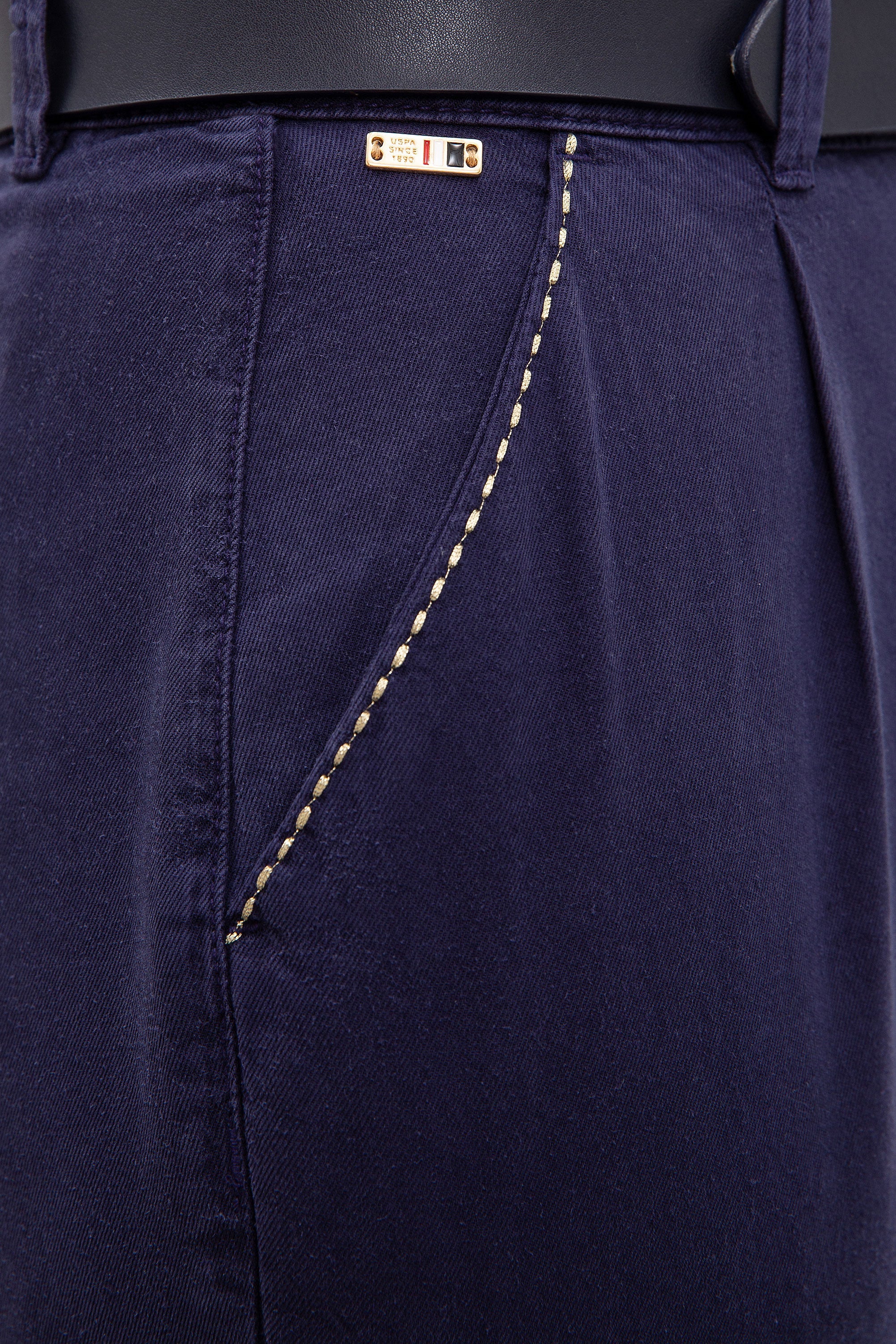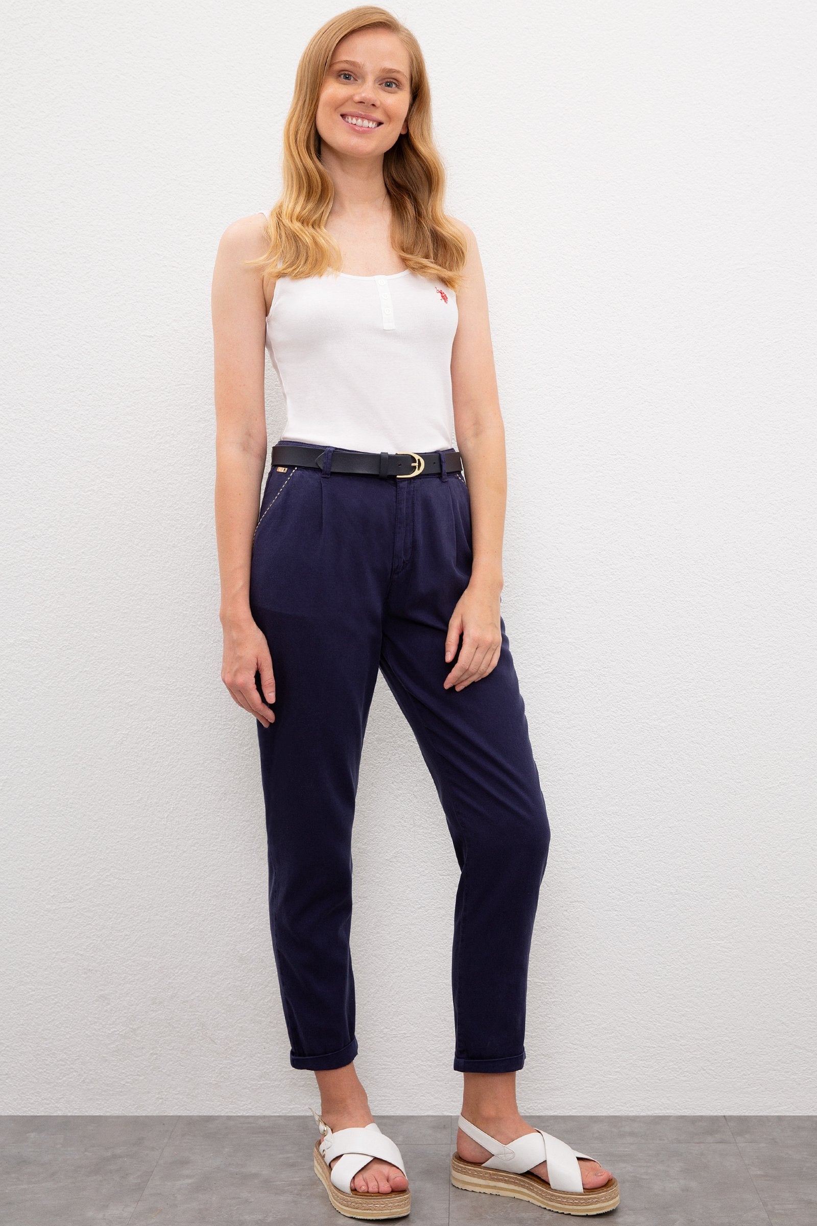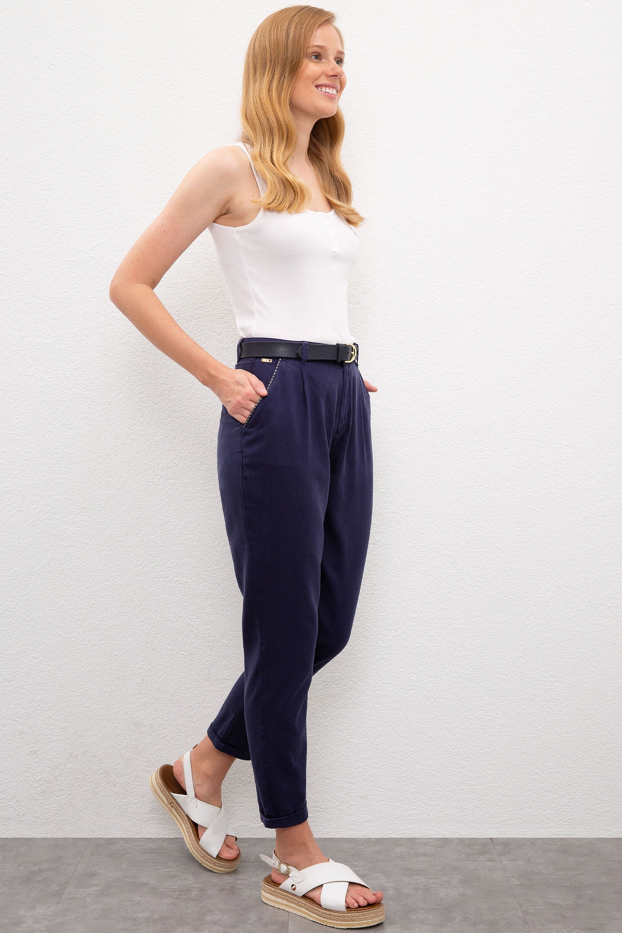 Elegantne pantalone tamnoplave boje koje pružaju kombinaciju udobnosti i sofisticiranosti za svakodnevno nošenje. Izrađene su od kvalitetnog materijala koji obezbeđuje prijatan osećaj pri nošenju, dok kroj pantalona omogućava lako kombinovanje sa različitim tipovima obuće i gornjim delovima odeće. Karakteriše ih tanki kaiš koji dodaje note modernog dizajna i pomaže u postizanju savršenog pristajanja. Pantalone su idealne za poslovne sastanke ili casual prilike, a diskretni džepovi doprinose njihovoj funkcionalnosti i praktičnosti.