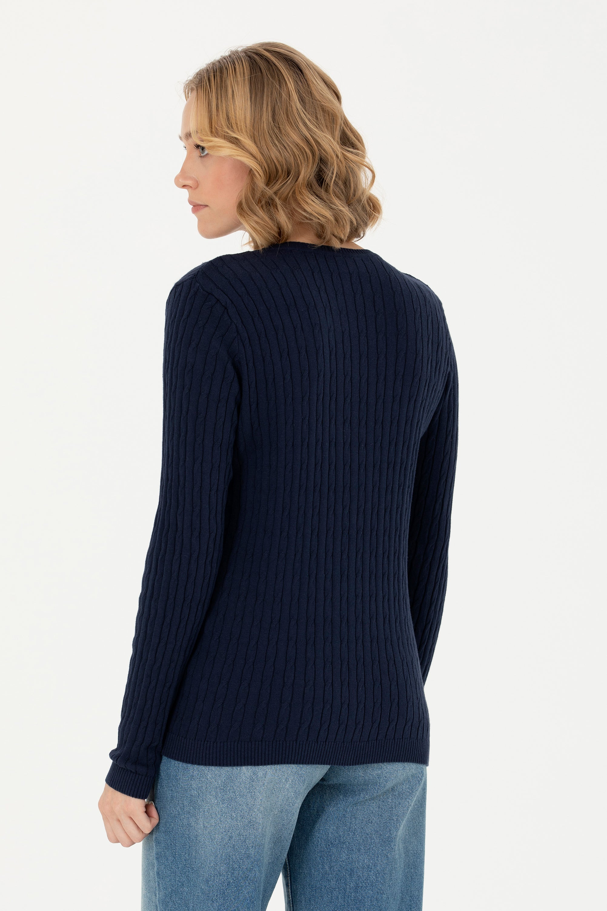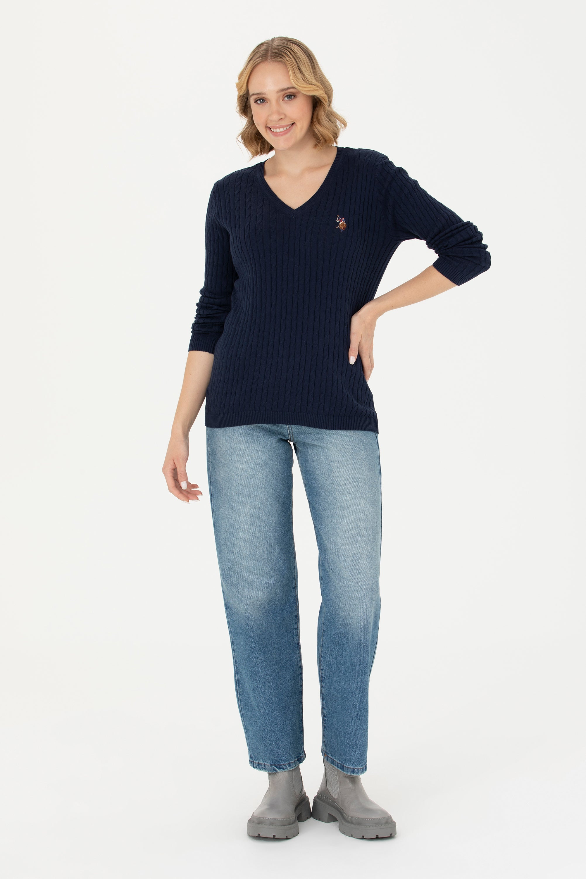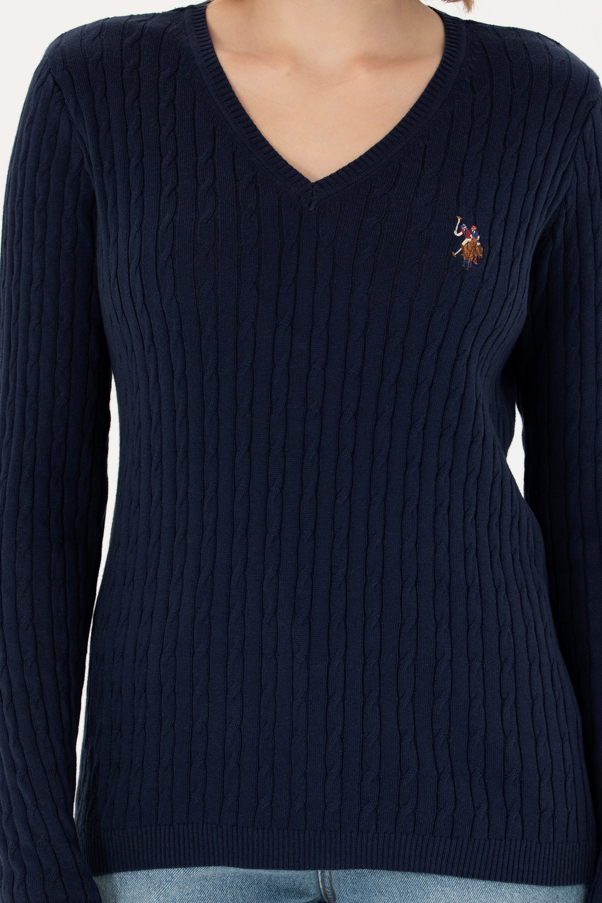 Klasični mornarski plavi džemper odlikuje se jednostavnošću i udobnošću. Karakteriše ga V-izrez koji doprinosi ležernom izgledu, dok rebrasti uzorak pruža dodatnu teksturu i vizuelni interes. Džemper ima duge rukave i standardnu dužinu koja se završava na liniji kukova, što ga čini praktičnim za svakodnevno nošenje. Mali logo na levoj strani grudi dodaje prepoznatljiv detalj brenda. Izrađen od mekog i prijatnog materijala, ovaj džemper je savršen za hladnije dane i može se lako kombinovati sa različitim stilovima pantalona ili suknji za opuštene ili poluformalne prilike.